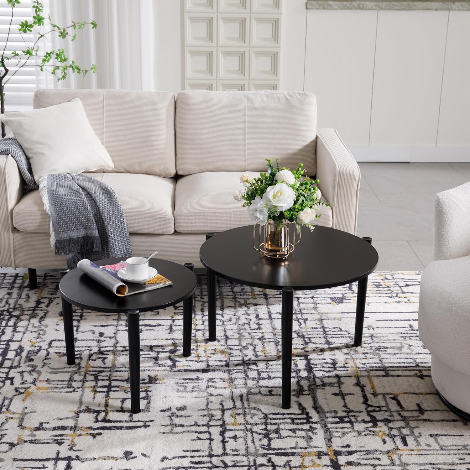 Wooden Round Modern Nesting Coffee Set of 2, Round End Table Side Table, Stacking Living Room Accent Tables for for Living Room Bedroom Balcony, Black