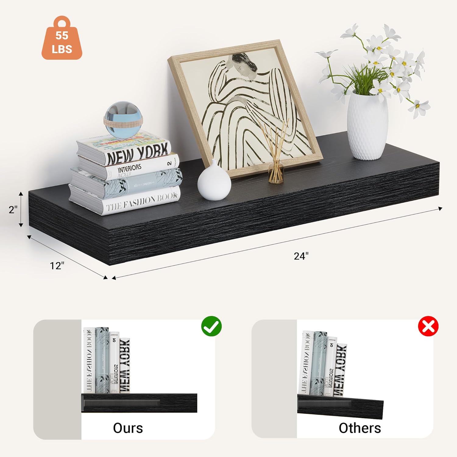 Heimlove 24 x 12 Inch Deep Floating Shelves Wall Mounted with Invisible Brackets,Storage Hanging Shelf for Wall Decor in Bathroom, Bedroom, Toilet, Kitchen, Living Room, Office Set of 1 (Black)