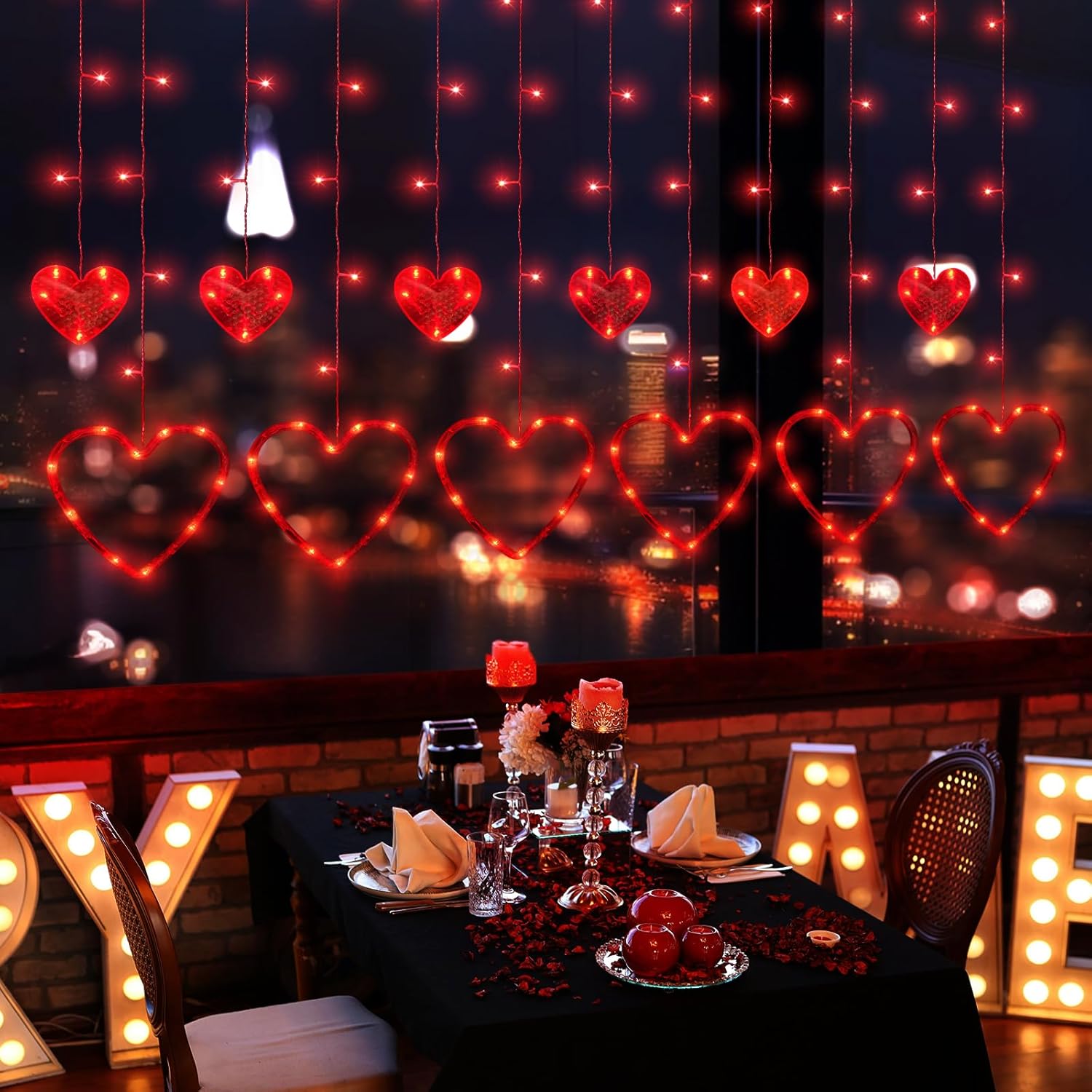 - Valentines Day Window Curtain Lights : Love heart window curtain lights with 138 Led, 12 Love Heart ornaments, 6 big and 6 small heart lights, exudesing a soft and charming light, creating a romantic evening atmosphere for you