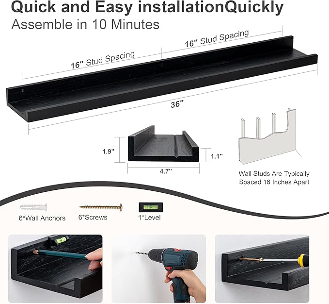 - Picture Wall Collage Decor: If you have dozens of pictures but don't know how to display them, FLYJOE picture ledge shelves(especially large size) for wall are perfect for you! With our hanging shelves, store and display different types and size of photo frames in one place with no worries of falling off.
