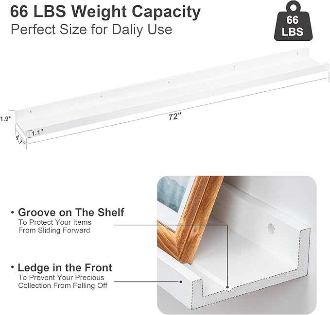 - Picture Ledge Design: Ideal for displaying photos, artwork, small plants, or collectibles, these shelves feature a thoughtful ledge design with a subtle lip and a shallow groove behind it. This design securely holds items in place while maintaining a clean, modern look.