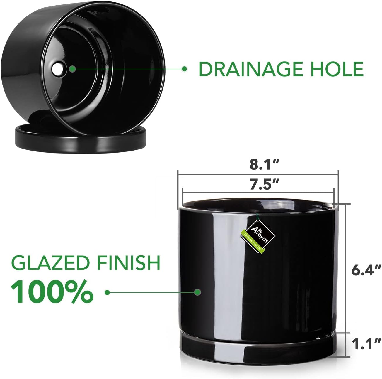 - Package Includes: An 8.3"D x 7.1"H Ceramic planter pot with a round drainage hole, an 8.3"D x 1"H ceramic saucer, a rubber plug, a drainage net and planter filler (Plant is not included).