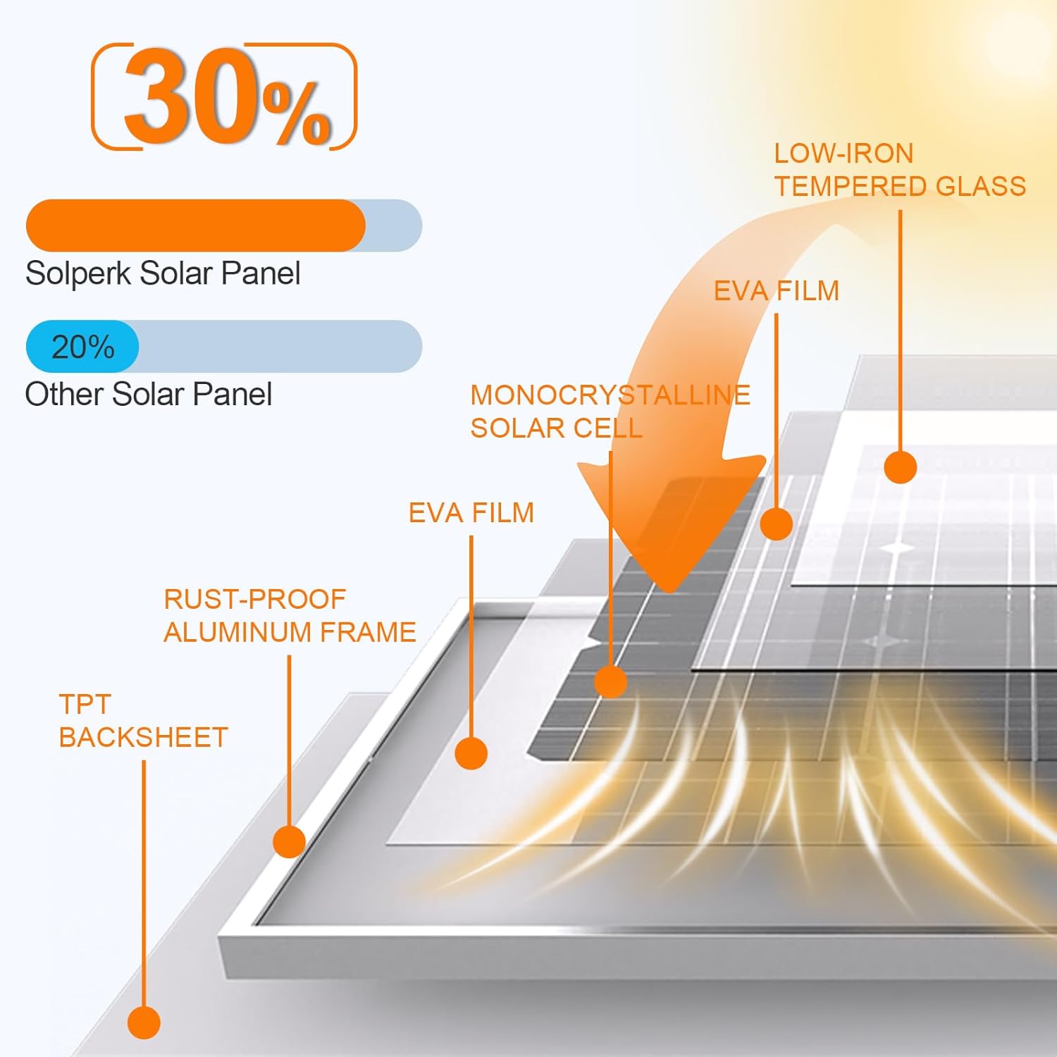 - 【360°Adjustable】The SOLPERK solar charger kit comes with a 360° adjustable bracket, allowing you to easily adjust it for optimal sunlight exposure. It can be easily installed on the ground, wall, or roof to maximize power generation. Additionally, the four corners of the solar panel are edged for added protection during use, ensuring the safety of the product and preventing scratches.