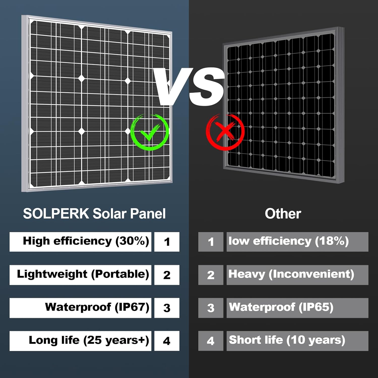 - 【Advanced monocrystalline silicon】 The 50 watt solar panel uses A+monocrystalline silicon, monocrystalline A+ solar cell has an excellent cell efficiency of 30%. Solar Charger Kit designed to charge and maintain 12V rechargeable batteries, including LiFePO, with a lifespan of up to 25 years, Lithium Ion, AGM, SLA, GEL, EF.