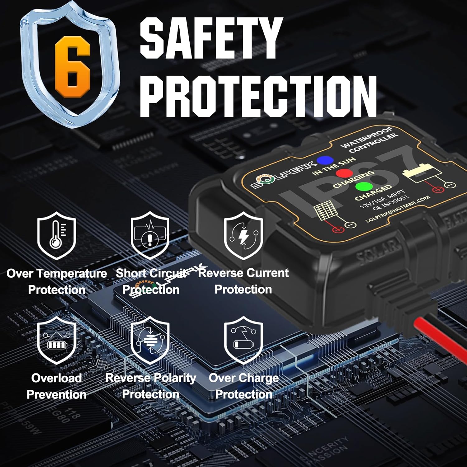 - 【High-Efficiency MPPT Controller】This advanced MPPT charge controller providing over 30% additional power compared to standard solar charge controllers. This fully waterproof MPPT controller can be completely submerged in water. It offers comprehensive protection for your battery, safeguarding against overcharging, deep discharging, excessive voltage, current surges, overloads, short circuits, reverse polarity, and overheating.