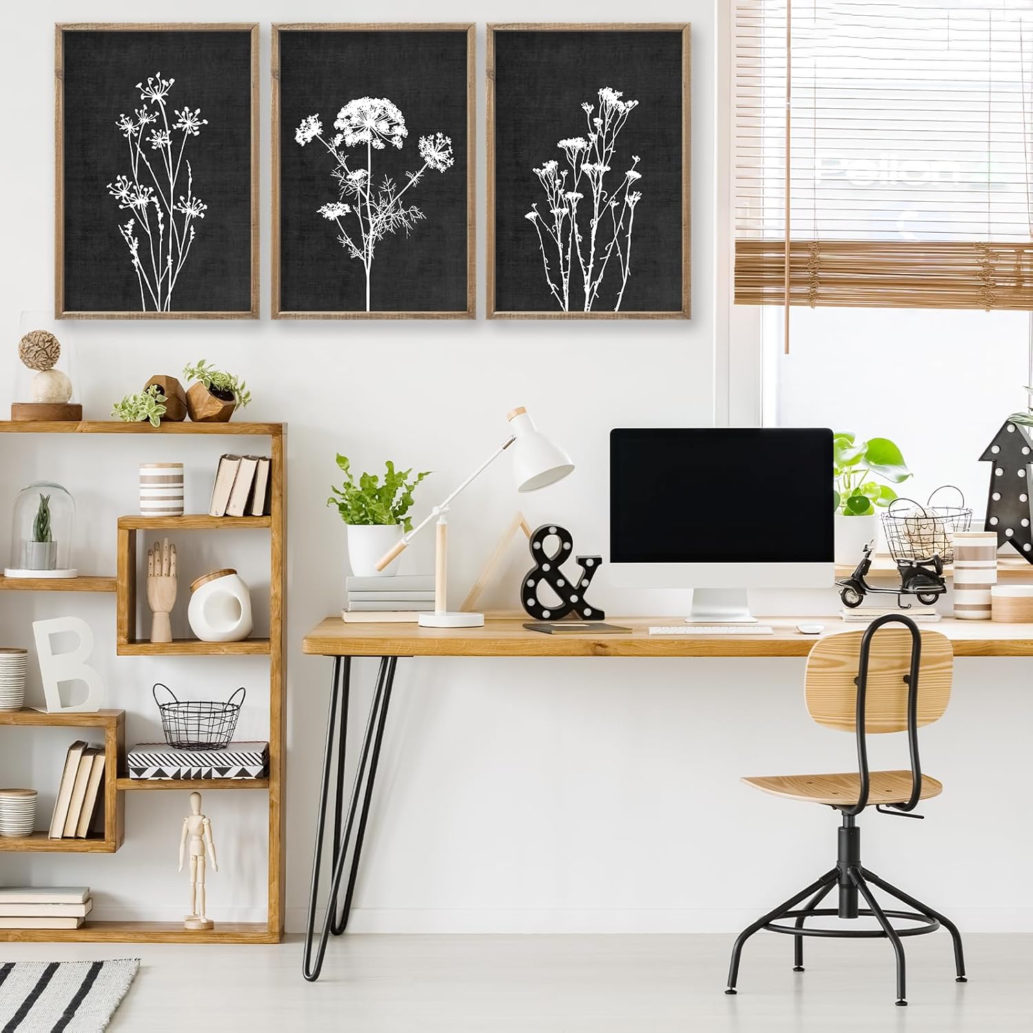 Flower Plant Wall Art Decor 24"x16" Set of 3 Black And White Botanical Painting Wood Framed For Minimalist Bedroom Office Rustic Living Room Abstract Wildflower Sign Hanging (Wood Black)