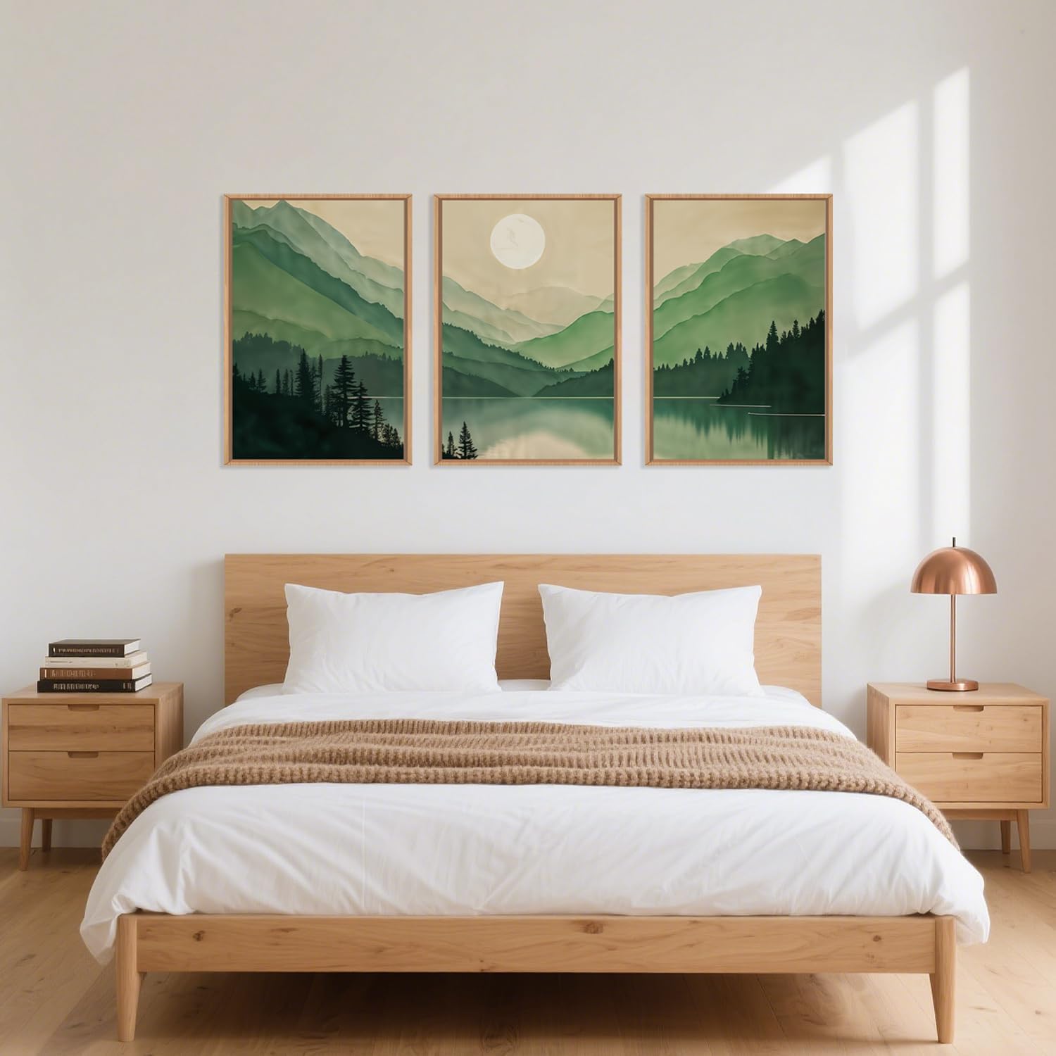 Celestdeco Watercolor Mountains Framed Canvas Wall Art Set, Boho Sun Forests Wall Decor, Green Scenery Wall Painting, Modern Woodland Artworks for Living Room, Bedroom, Dining Room, Office - 16"x24"x3