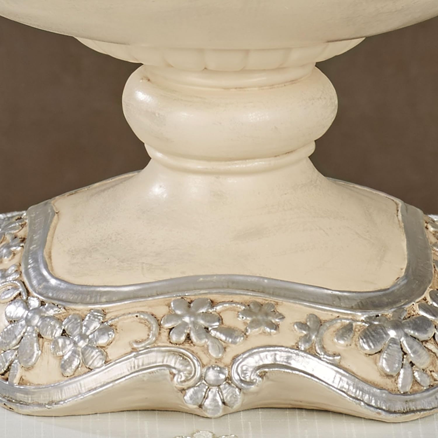 - DESIGN ELEMENTS: Centerpiece bowl with raised silver florals and scrolls. Handpainted resin accents have an ivory and silver background. Perfect as a centerpiece bowl orbs set for any elegant decor.