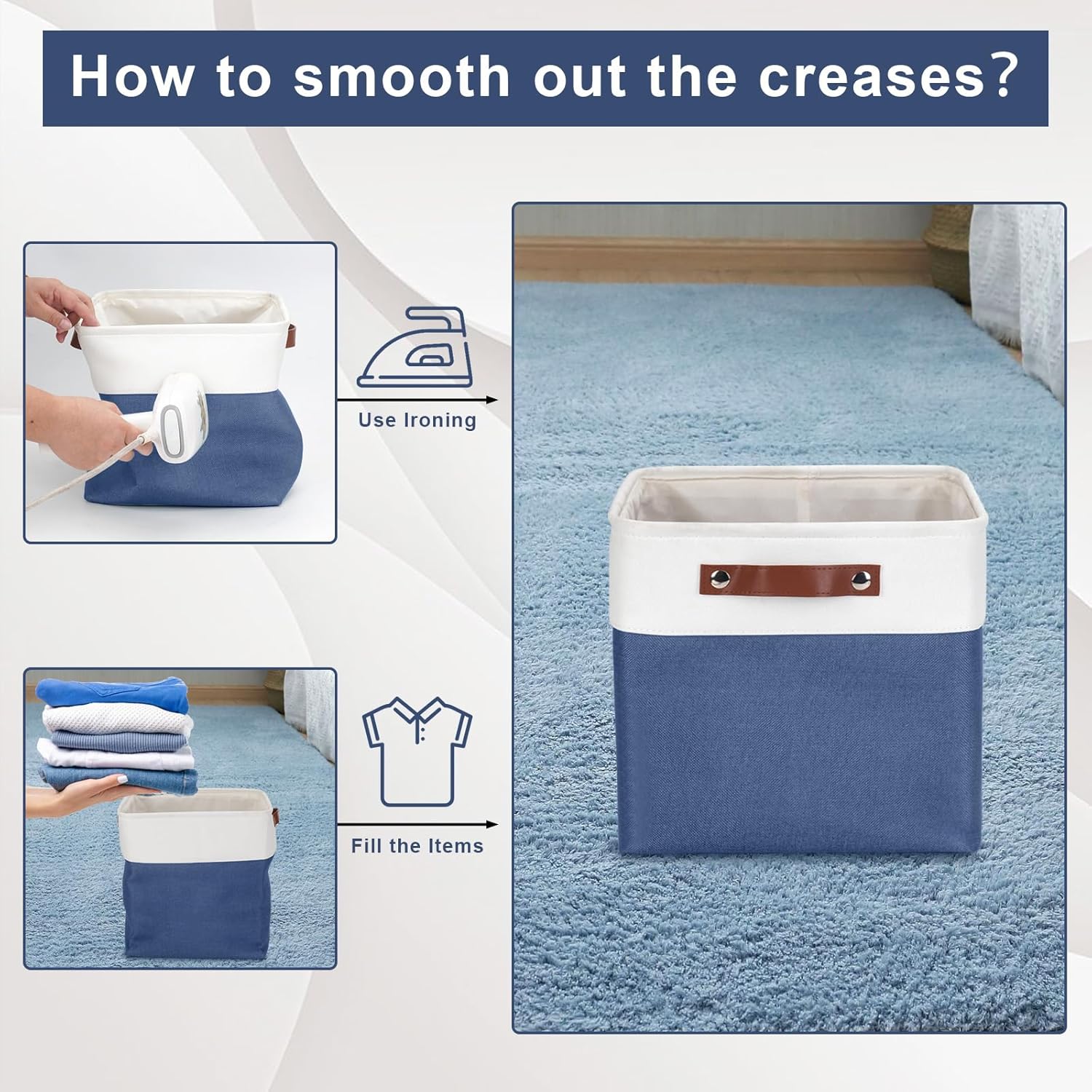 - 【Maintenance & Care Tip】 - Collapsible design for space saving. Our foldable baskets comes in a compression packing which may result in wrinkled storage bin during the long transit. Get rid of the wrinkles by either stuffing the fabric storage bins with blankets and pillows for a few days or steam iron them at low-heat setting. The organization baskets are easy to clean, you can dust the basket with a soft cloth with light soapy water when needed. Not recommended to machine wash.