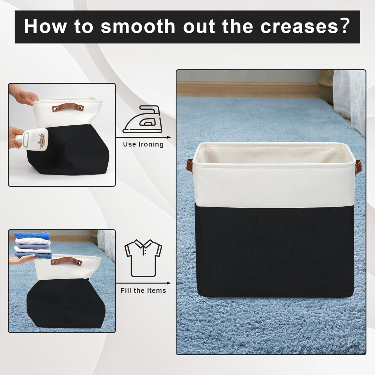 - 【Maintenance & Care Tip】 - Collapsible design for space saving. Our foldable baskets comes in a compression packing which may result in wrinkled storage bin during the long transit. Get rid of the wrinkles by either stuffing the fabric storage bins with blankets and pillows for a few days or steam iron them at low-heat setting. The organization baskets are easy to clean, you can dust the basket with a soft cloth with light soapy water when needed.