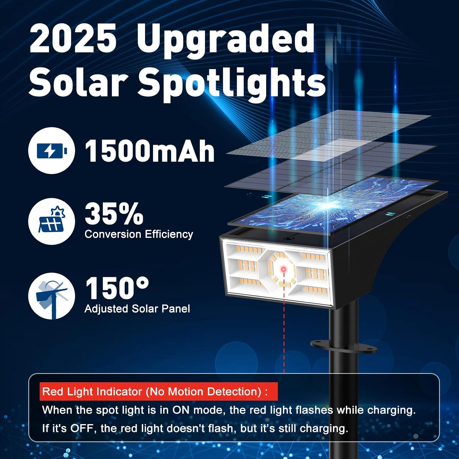 - 【𝐋𝐨𝐧𝐠-𝐋𝐚𝐬𝐭𝐢𝐧𝐠 𝐈𝐥𝐥𝐮𝐦𝐢𝐧𝐚𝐭𝐢𝐨𝐧】 Equipped with 56 LEDs, our solar spotlights create the perfect lighting effect wherever they are placed. The 150° adjustable head allows you to direct light exactly where you need it. Harness the power of the sun to brighten your garden without high electricity costs. With a maximum brightness of 1000 lumens, these solar landscape spotlights provide 10-24 hours of illumination depending on charge time—longer, brighter, and more durable than other solar spotlights on the market.