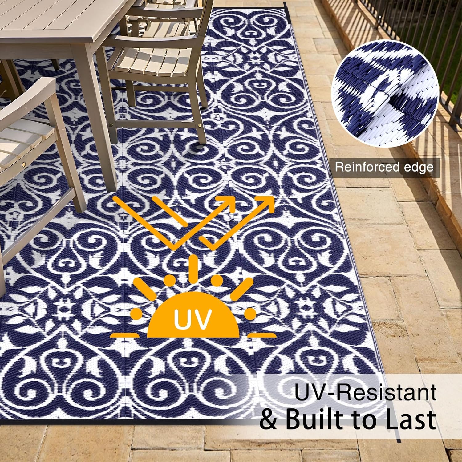 - UV-Resistant & Durable: Equipped with a UV-protective layer, this outdoor patio rug resists fading, keeping its vibrant colors intact even under prolonged sun exposure. Reinforced edges add extra durability, making it a reliable choice for all-weather use.