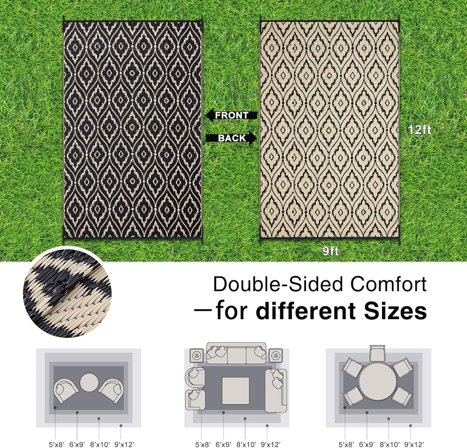 OLANLY Outdoor Rug 9x12 ft Waterproof, Outdoor Plastic Straw Rug with Geometric Pattern Clearance, Reversible RV Mat for Patio, Camping, Balcony, Deck, Backyard, Black & Beige