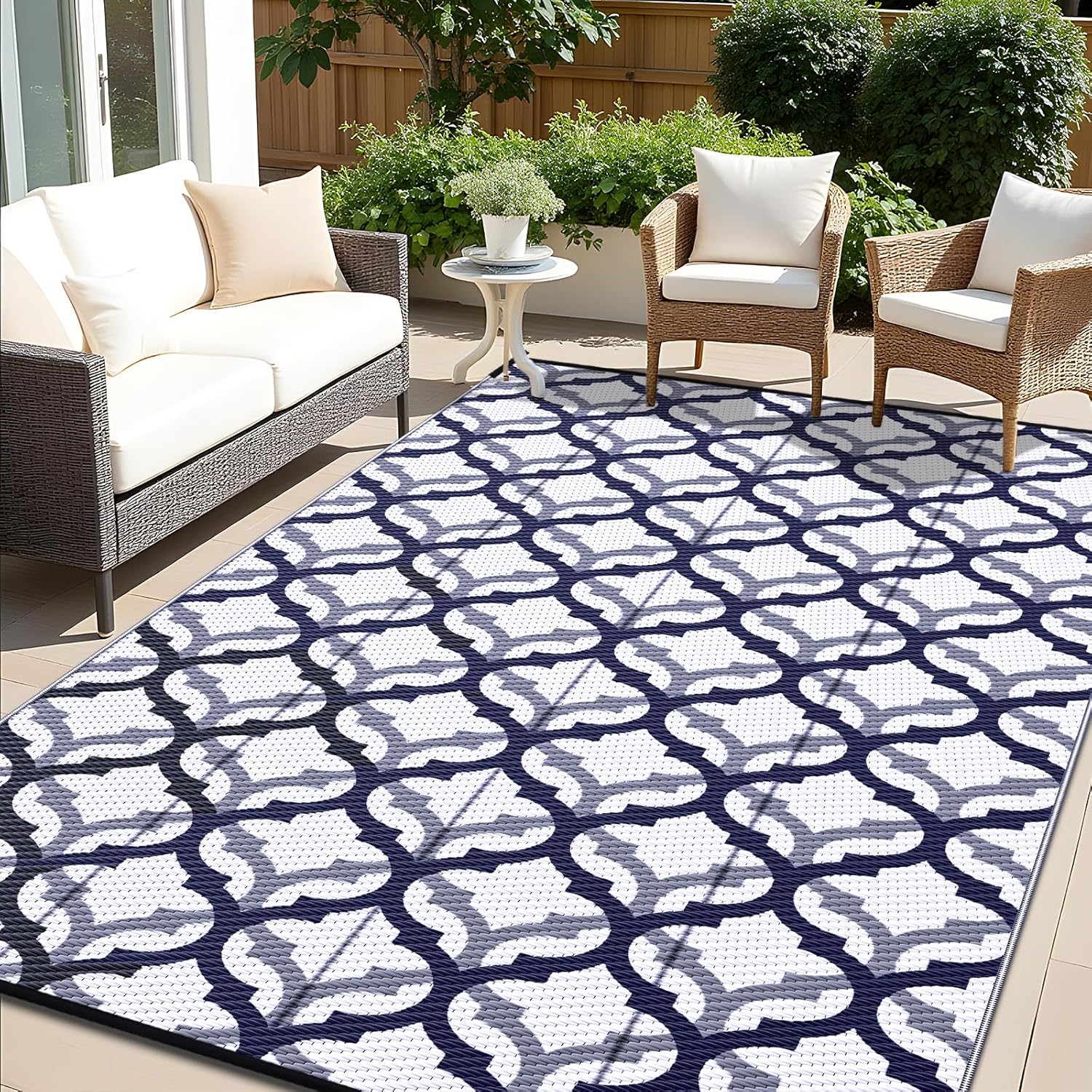 OLANLY Reversible Outdoor Rug 9x12 ft Clearance, Waterproof Outdoor Plastic Straw Rug with Interlacing Pattern, RV Mat for Patio, Camping, Balcony, Deck, Backyard, Navy & White