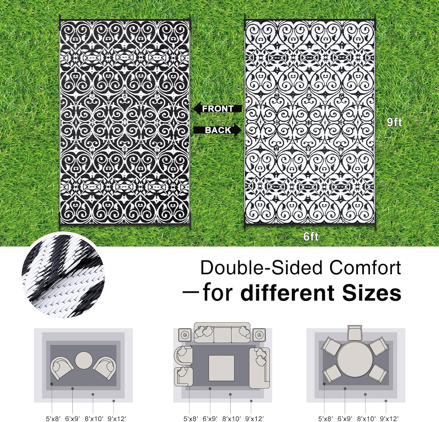 OLANLY Outdoor Rug Waterproof 6x9 ft Clearance, Reversible Outdoor Plastic Straw Rug with Floral Pattern, RV Mat for Patio, Camping, Balcony, Deck, Backyard, Black & White
