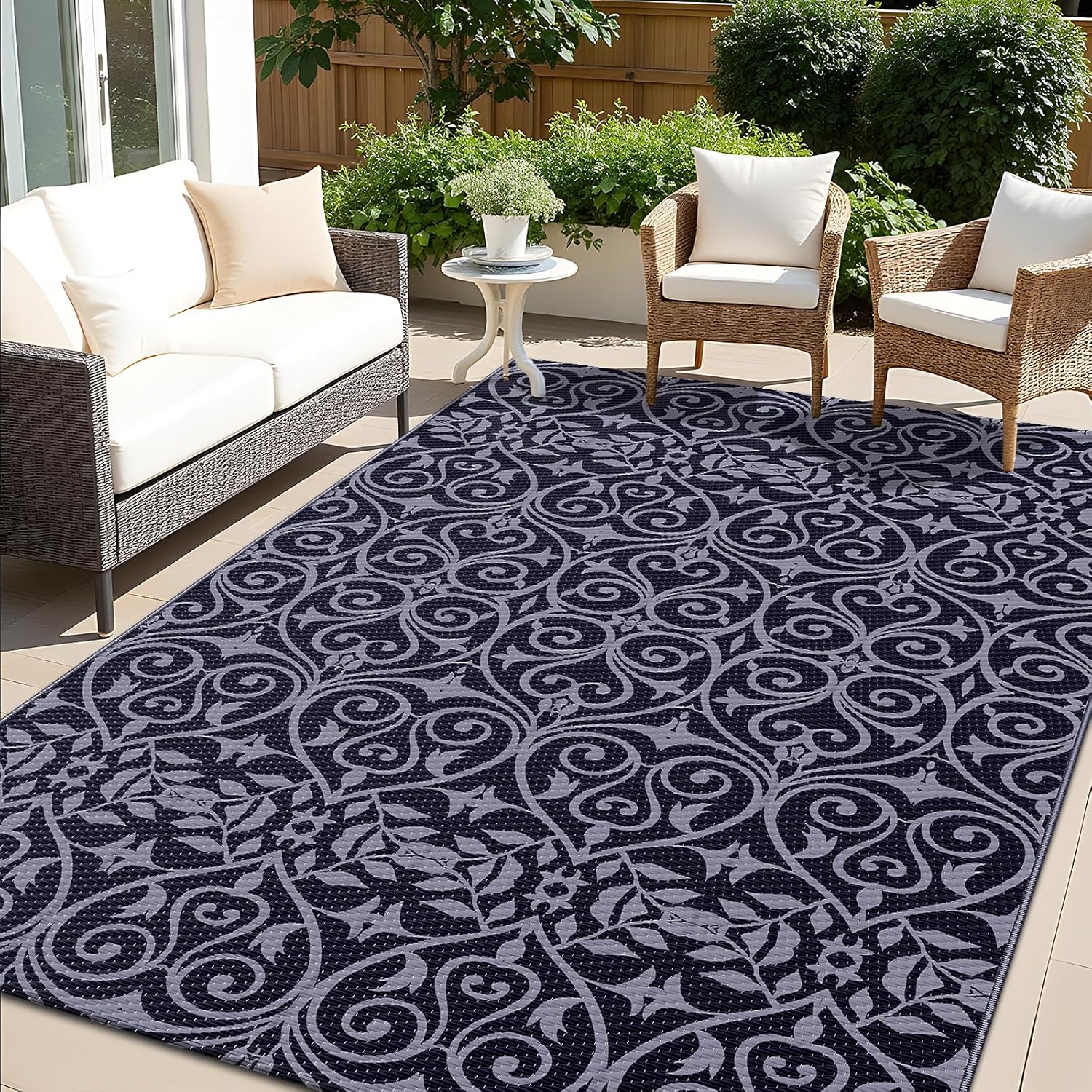 OLANLY Outdoor Rug Waterproof 5x8 ft Clearance, Reversible Outdoor Plastic Straw Rug with Floral Pattern, RV Mat for Patio, Camping, Balcony, Deck, Backyard, Black & Grey