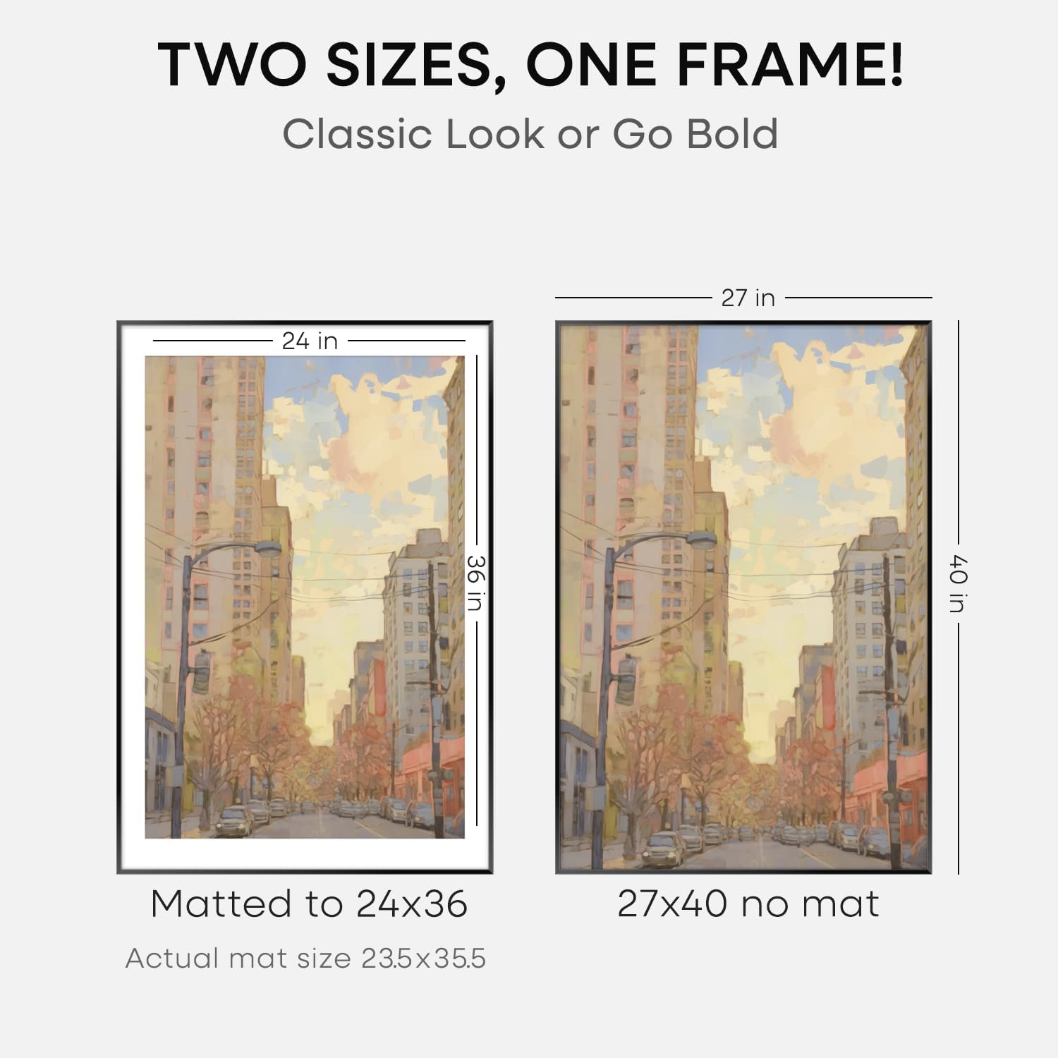 - MATTED OR EDGE-TO-EDGE—YOUR CALL. A crisp 24x36 white mat creates negative space, elevating your image with gallery precision. Or remove it for 27x40 bold, uninterrupted impact.