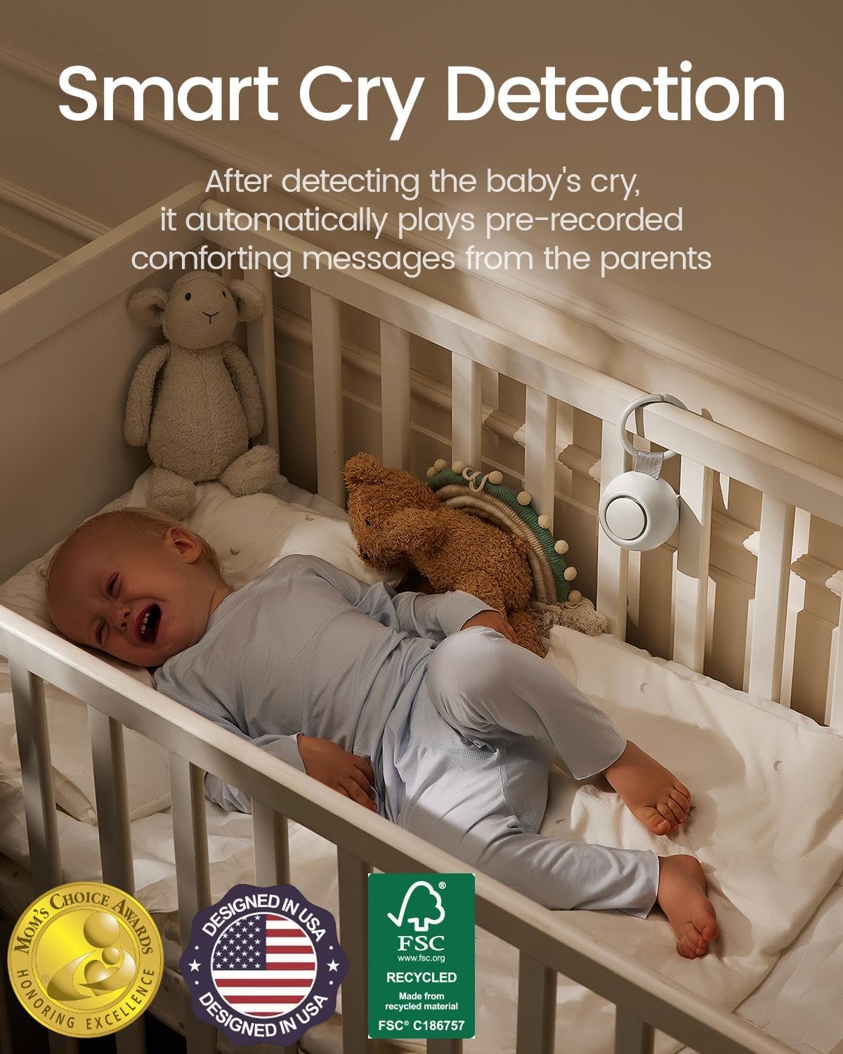 - ๐๐ ๐๐ฟ๐ ๐๐ฒ๐๐ฒ๐ฐ๐๐ถ๐ผ๐ป: Equipped with AI Cry Detection technology, this device automatically detects your babyโs cries and plays pre-recorded comforting words along with soothing sleep music. With directional sound field technology, it can improve the noise blocking effect by 37%. This noise machine for baby offers smart, automated comfort when you need it most.