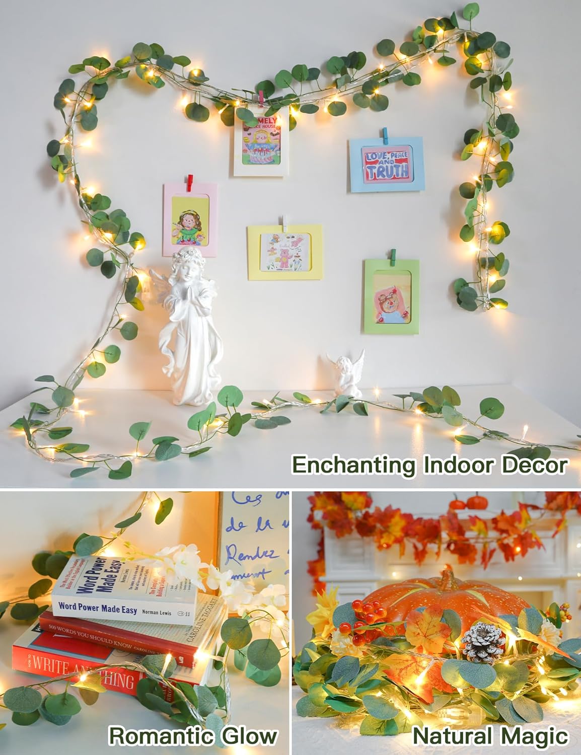 suddus Vines with Lights Plug in, 33ft 100 LED Eucalyptus Garland String Light Connectable with Remote, Leaf Lights for Bedroom, Room, Wall, Garden, Party, Wedding Decor (Warm White)