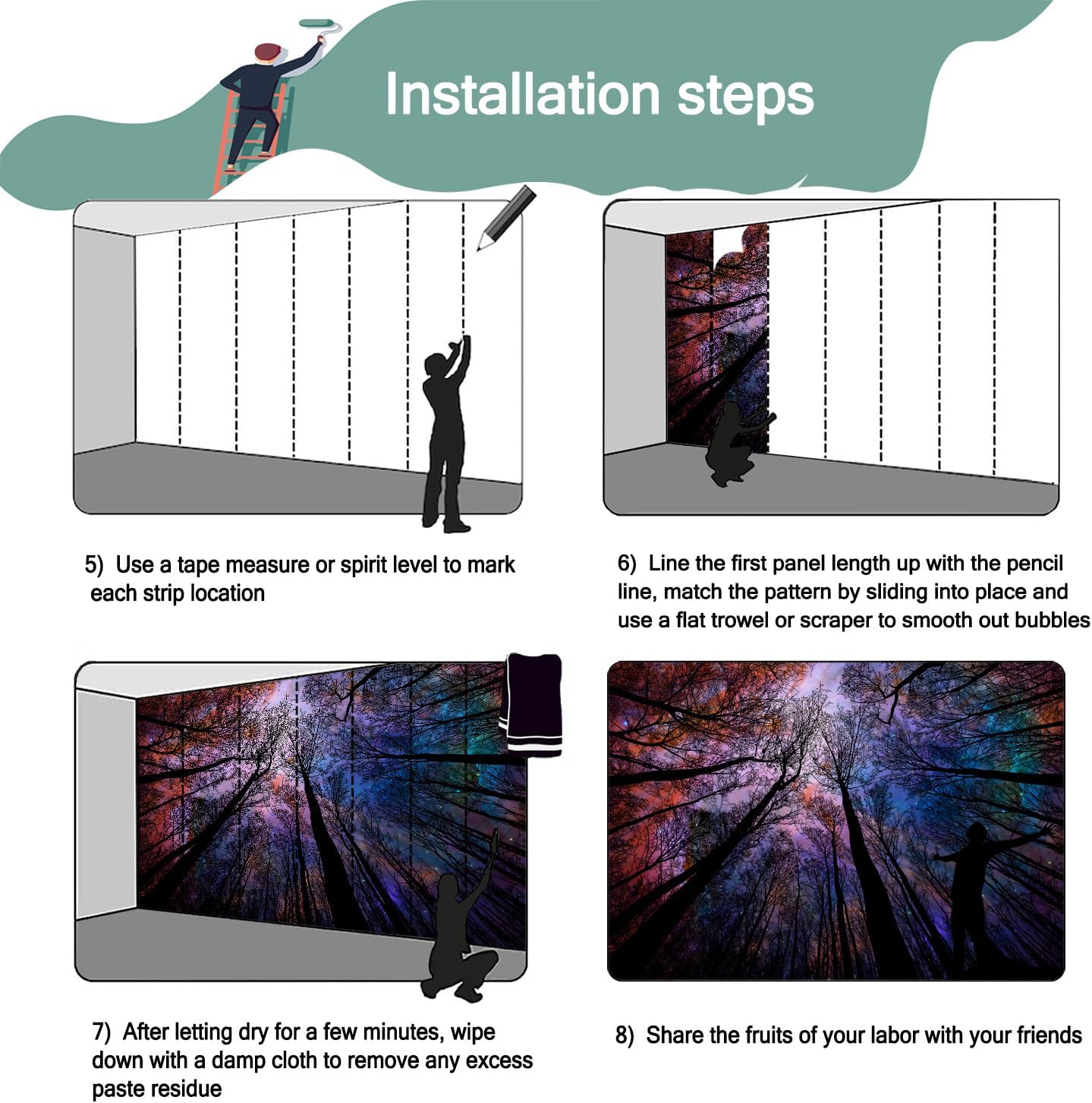 - Mural wallpaper size: 180 "W x 115 "H, divided into 9 sections, each section is labeled with a number underneath, there is no need to overlap the pattern when installing, just install according to the number labeled underneath the panel