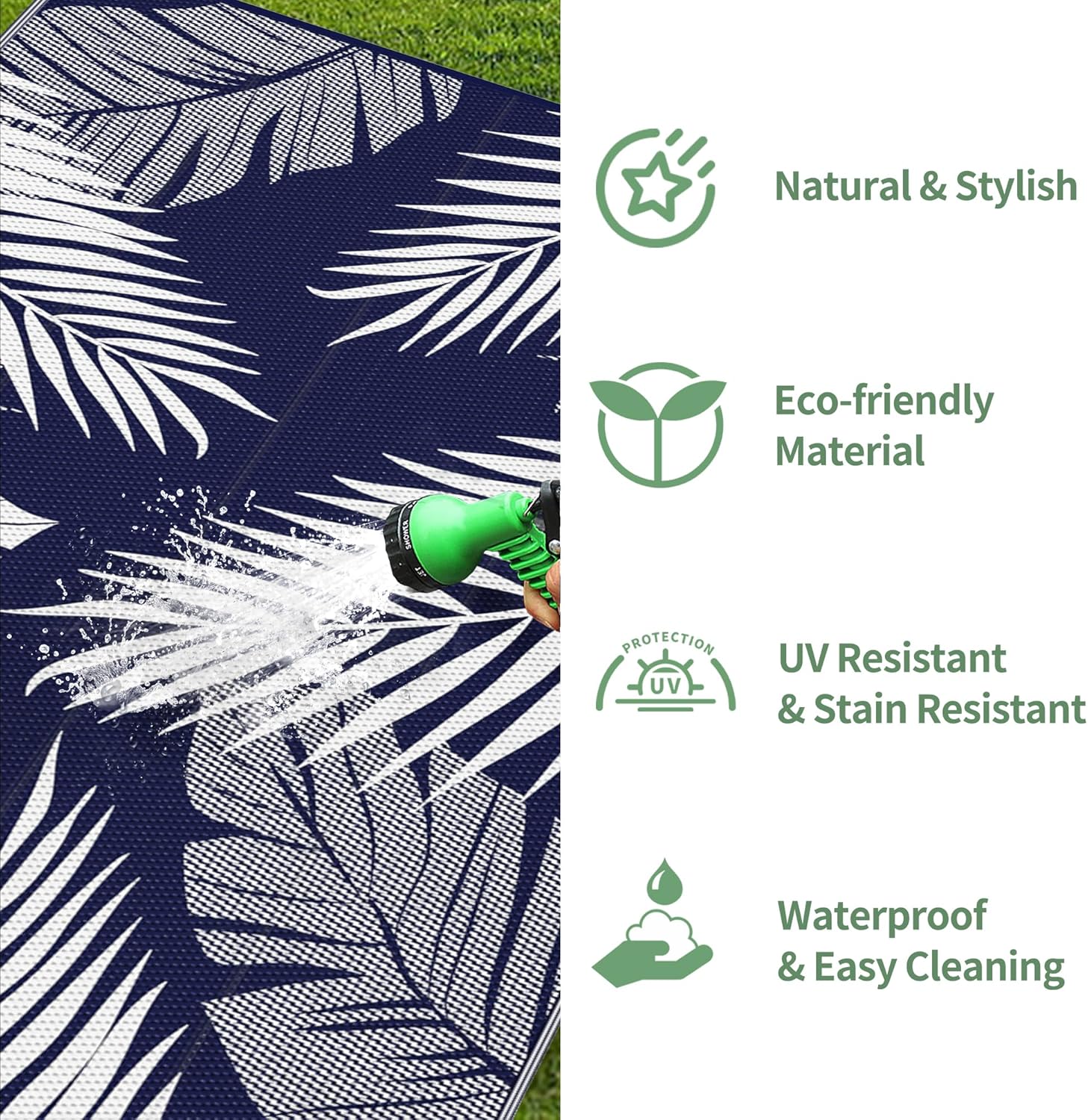 - Waterproof & Easy To Clean: Our indoor and outdoor rugs are waterproof, stain resistant, non-slip, easy to clean and well-breathable. As an outdoor patio rug or picnic mat, you don't have to worry about drink spills, food stains, sand or dirt, just rinse with water or wipe with a damp cloth. Plus, the breathable material allows it to air dry in minutes. You can enjoy your exclusive leisure time with your family or friends outdoors or indoors without any worries