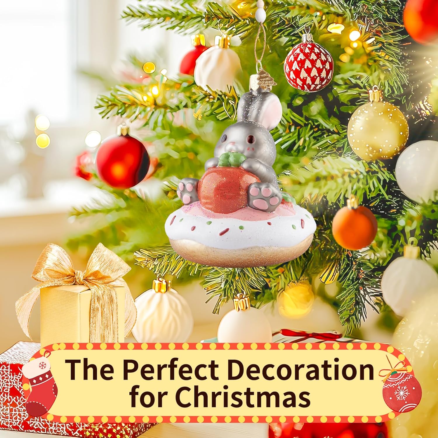Rabbit Donut Christmas Tree Ornaments,Blown Glass Ornaments,Personalized Rabbit Collection Hanging Ornaments,Donut Pendant Ornament,Christmas Decorations for Animal Lovers Holiday Party Gifts