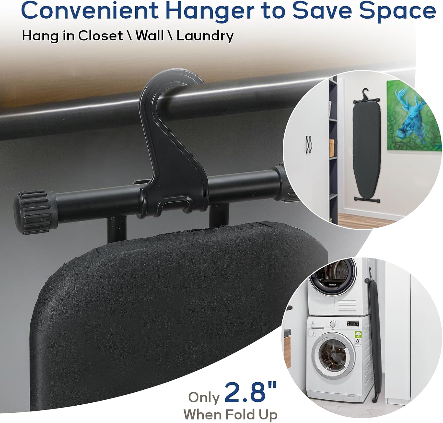 - Smart Closet Hanger: With the equipped hanger, you can hang the ironing boards on a wall, closet, laundry room or even behind a door in your house. The safety lock will prevent the board from opening accidentally