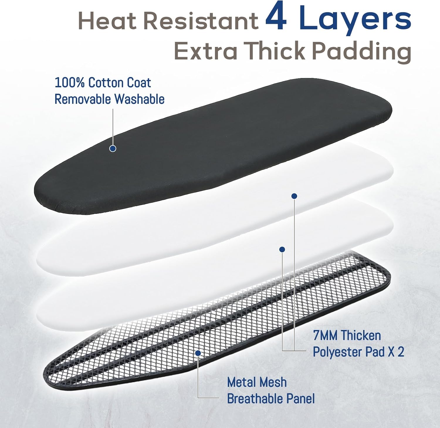 - Extra Thick Cover and Pad: Heat resistant cover is made of 100% cotton. It comes with dual layers thick paddingfor enhanced ironing smoothness and a flat surface for faster ironing efficiency