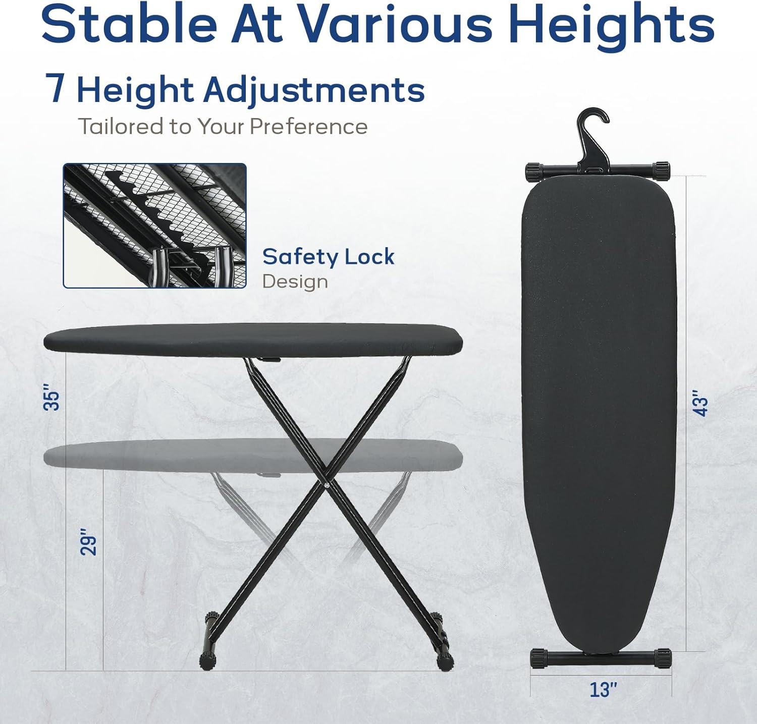 - Full Size Ironing Board: RAINHOL Black iron board is amazing for small space, measuring 43x13 when in use and 46x13x3 when folded. From 29 to 35 in, the adjustable height lets you define your own comfortable ironing experience