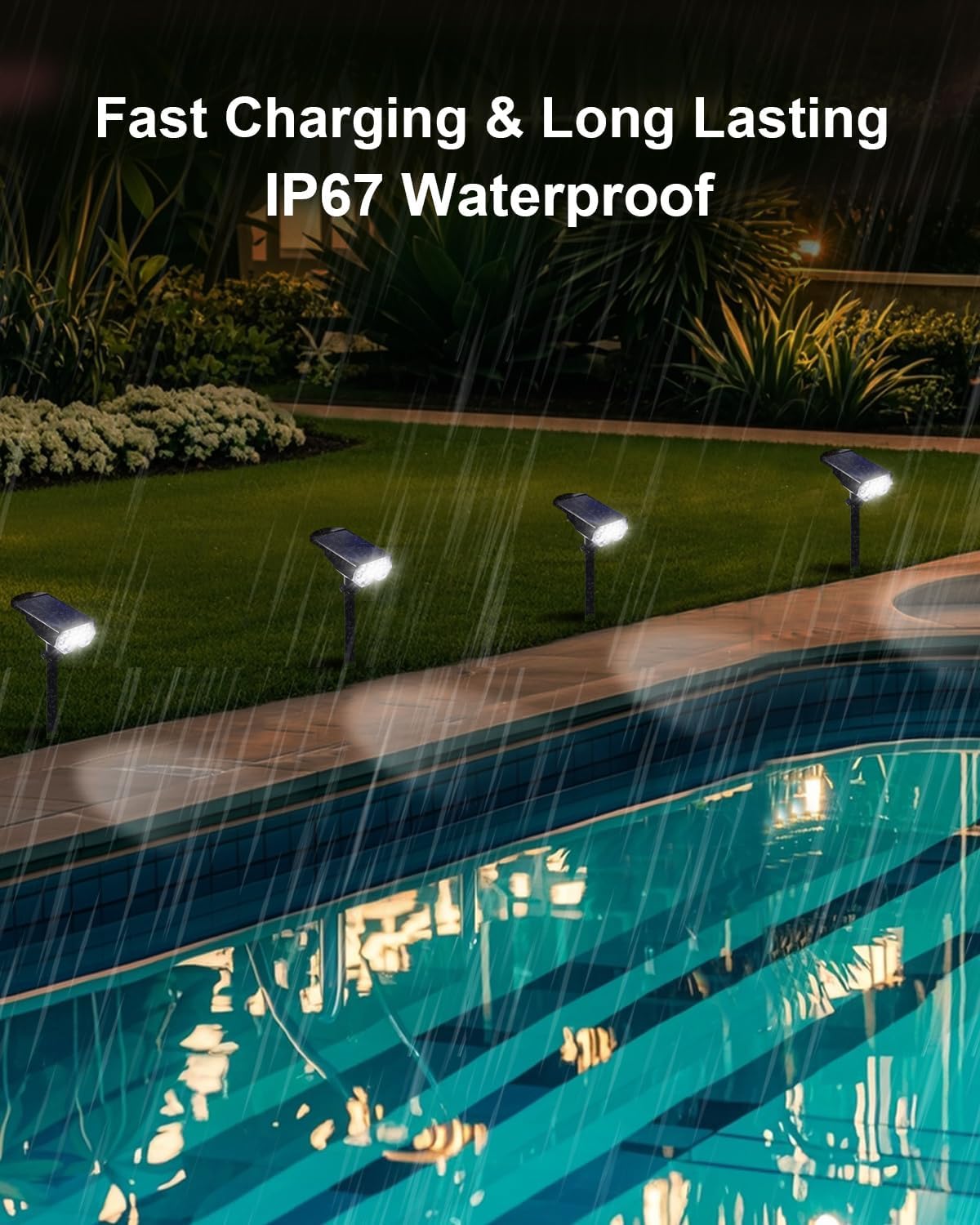 - 💦𝐀𝐝𝐯𝐚𝐧𝐜𝐞𝐝 𝐖𝐚𝐭𝐞𝐫 𝐑𝐞𝐬𝐢𝐬𝐭𝐚𝐧𝐜𝐞, 𝐄𝐧𝐝𝐮𝐫𝐢𝐧𝐠 𝐒𝐭𝐫𝐞𝐧𝐠𝐭𝐡:The solar powered spotlights feature an integrated, exquisite design that outperforms split-type solar lights, especially in harsh weather conditions like storms, showcasing superior waterproof capabilities. Crafted with durable ABS material and equipped with a 2000mAh high-capacity battery, our fixtures provide a long-lasting and reliable lighting experience for your outdoor spaces.