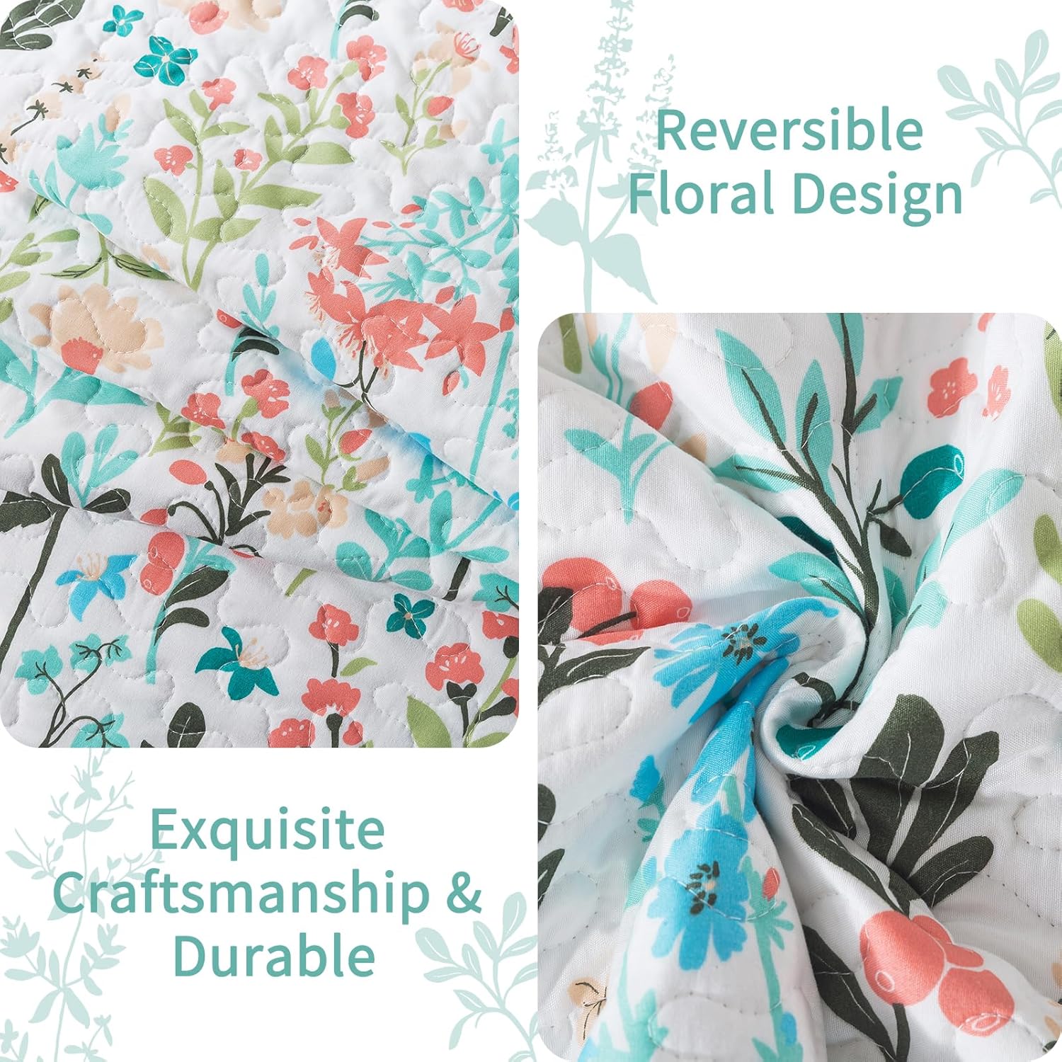 VAPUTAR Queen Quilt Bedding Set-3 Pieces Botanical Quilt Queen Size (90 x 98 inch), Reversible Queen Coverlet with Garden Style Floral Pattern, Bedspread Queen Size Suitalble for All Season.