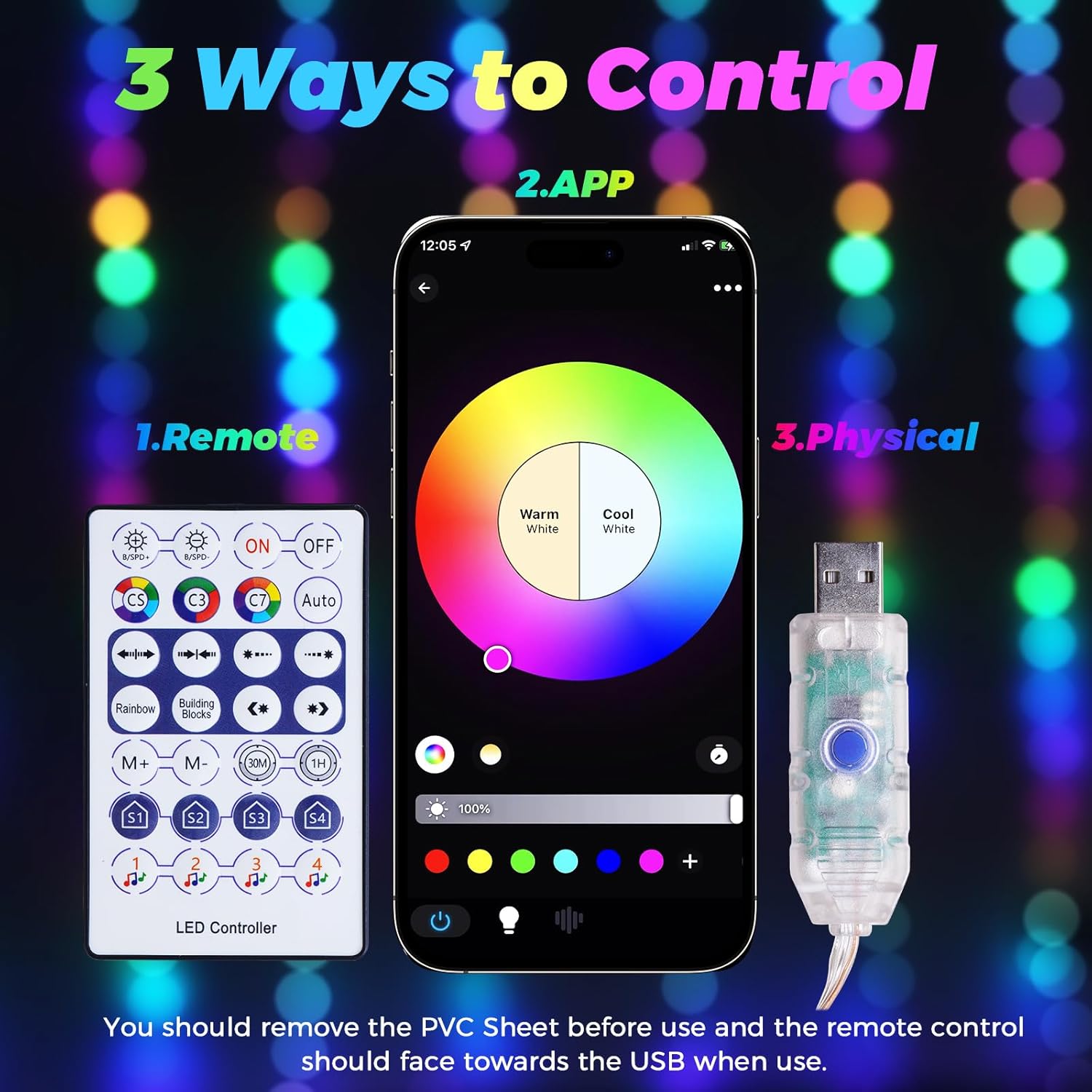 - App Functions: You can choose hundreds of colors through app. And allows the timer function to accurate to the second. App also allow your playlists to sync with the DIY curtain string lights, the light can change and beat with the rhythm of the surrounding music