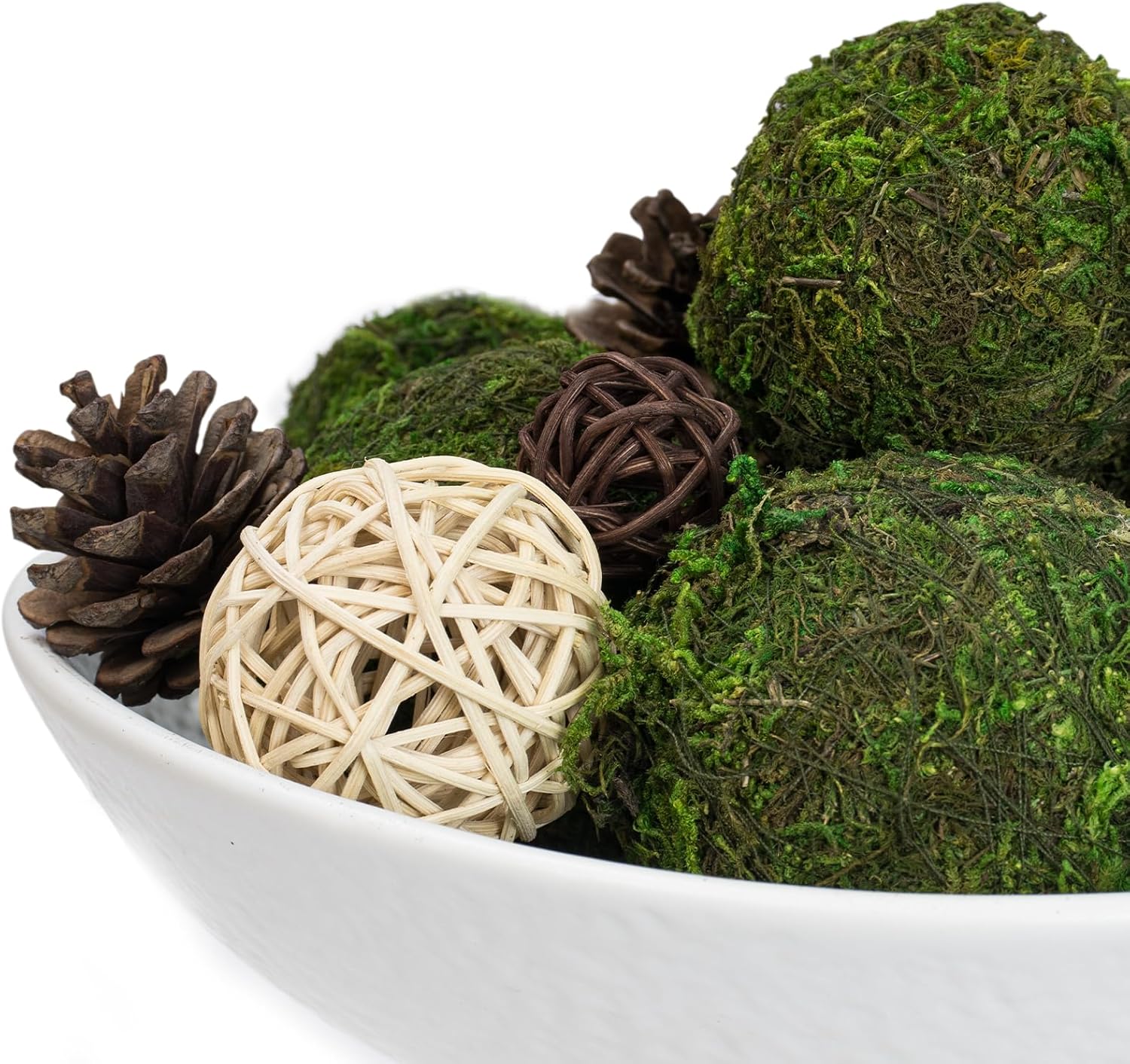 - Complete Decorative Set: The package includes a beautifully textured ceramic bowl and 16 decorative balls—10 moss balls, 6 rattan balls, and 2 pine balls. This set offers rich detail and durable quality, making it a striking addition to any space.