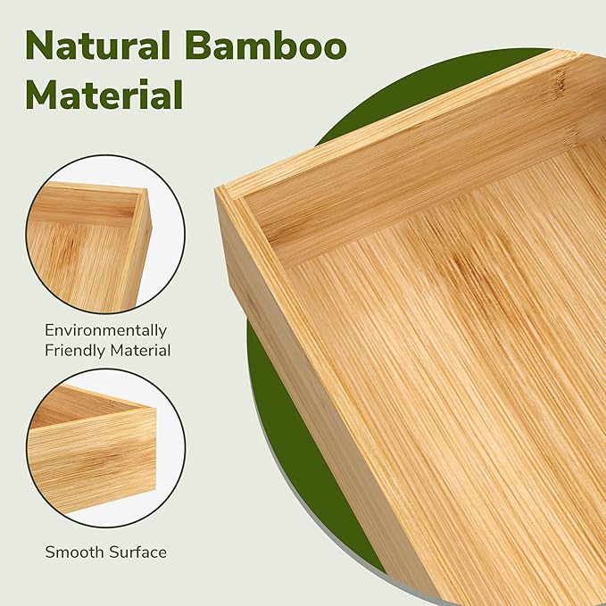 - High Quality Bamboo Material: The bamboo drawer organizer is made from high quality natural bamboo, which has a fine texture, smooth surface and warm feel; Bamboo is renewable, fast-growing, sustainable, and structurally sturdy, ensuring that the organizer will stand up to daily use and maintain its shape over time