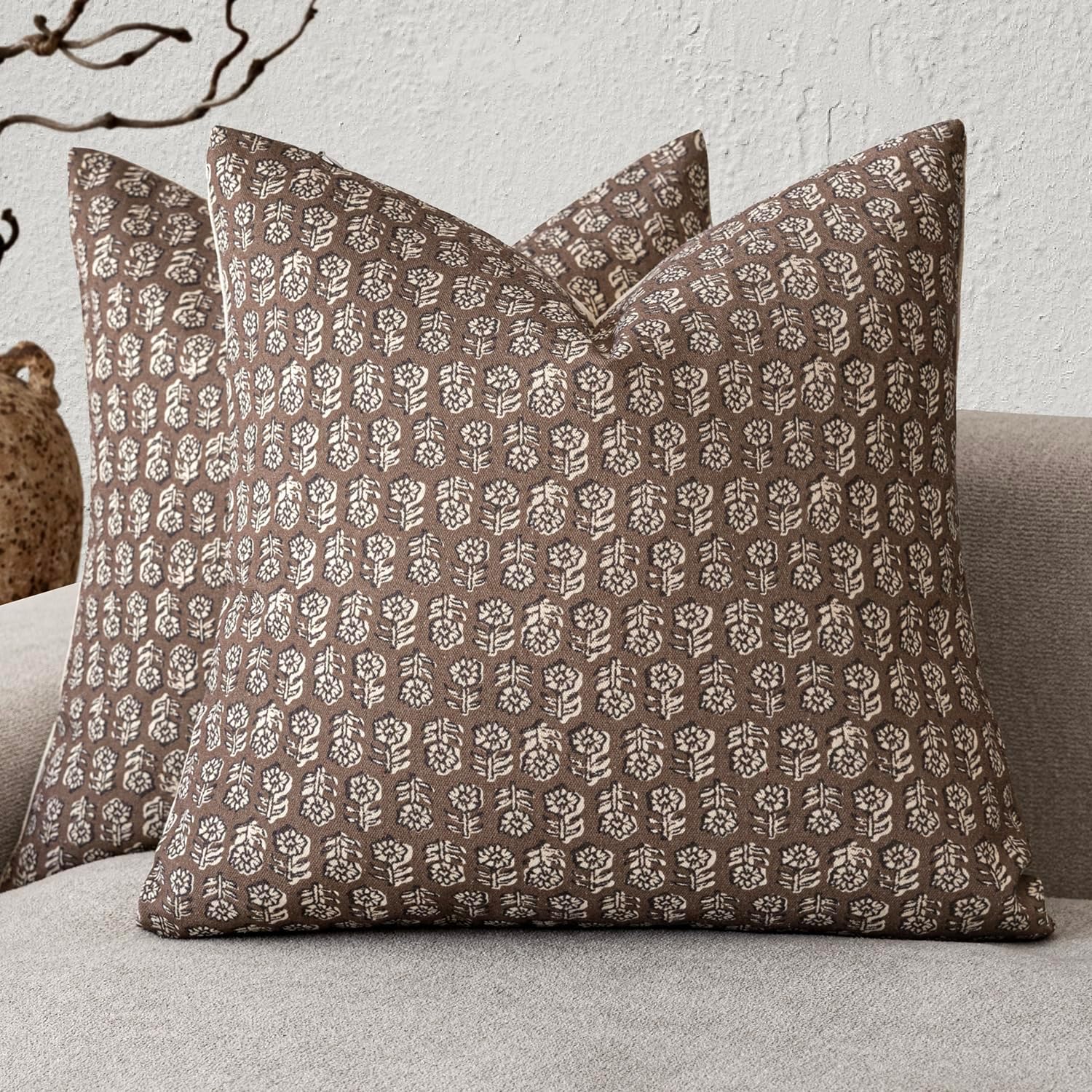 Foindtower Set of 2 Decorative Neutral Floral Print Throw Pillow Covers Vintage Accent Farmhouse Cushion Covers Boho Home Decor for Sofa Chair Couch Bedroom Living Room Outdoor,18×18 Inch,Brown
