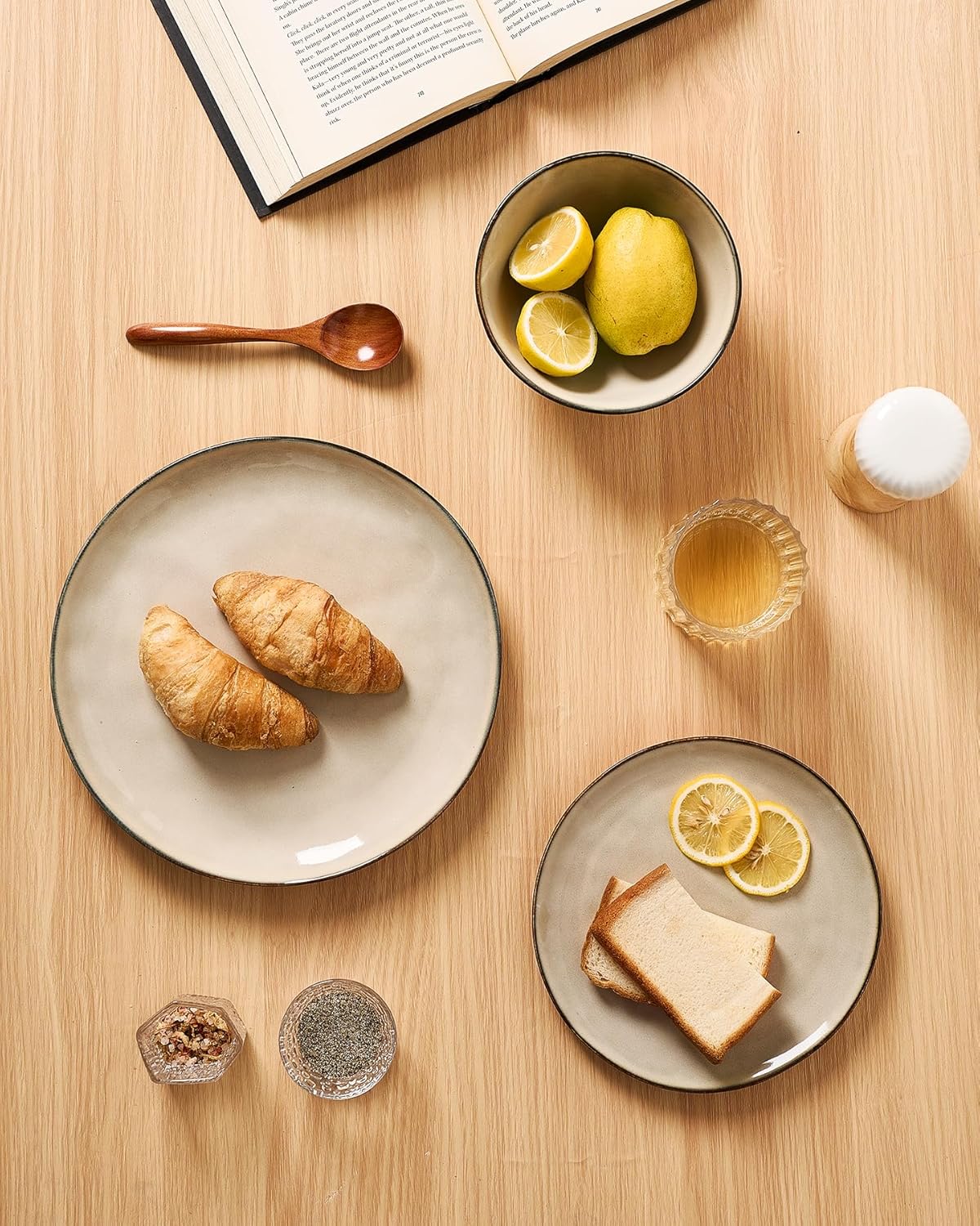 Famiware Dinnerware Sets for 4, Ocean Round 12-Piece Kitchen Plates and Bowls Sets, Microwave and Dishwasher Safe, Scratch Resistant, Light khaki