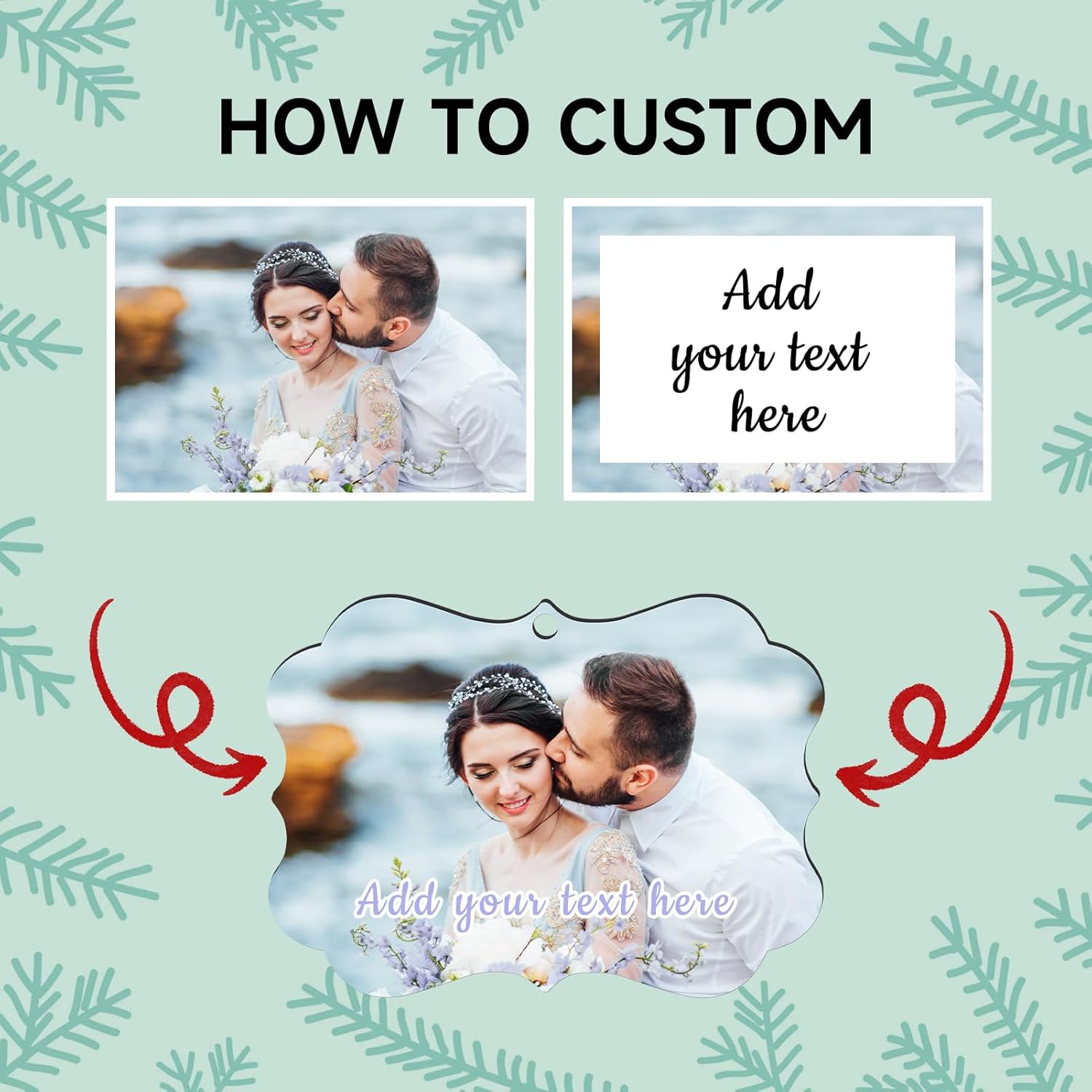 - 【Custom Photo Text Christmas Ornaments】Click on the " Customize Now " button to design your own Christmas ornament special with desired Photo, Picture, Logo, Text. Simply upload any photo, fit by the corners. Choose your font color, fill in the optional blank with your text. Our designers will do the rest.
