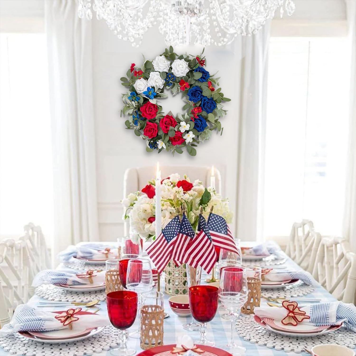 - ①【Faux Patriotic Wreath】-This patriotic wreath is used multiple material of flowers and leaves,premiun! The bright red white and blue roses mix which looks very eye-catching.Different kinds of leaves such as Eucalyptus leaves add colors, texture and dimension to doors, walls or above mantels.Rich appreance!