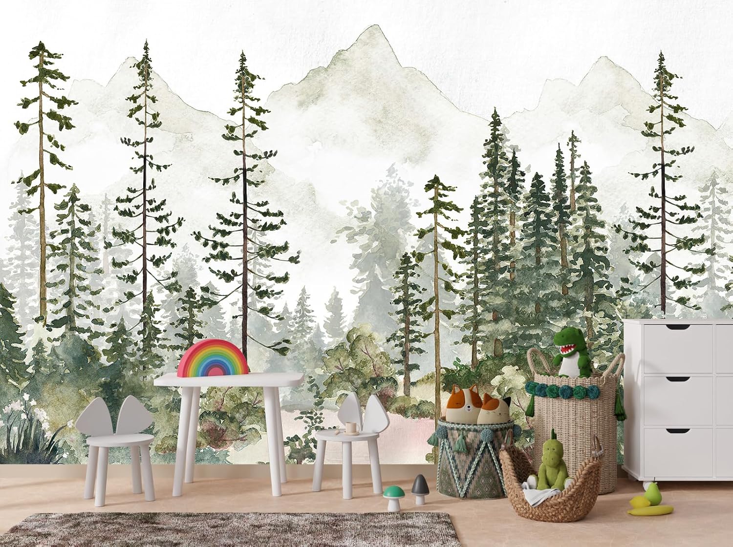 Kids Nursery Wallpaper Green Pine Forest Woodland Wall Mural for Boys Girls Bedroom Living Room(Not Peel and Stick)