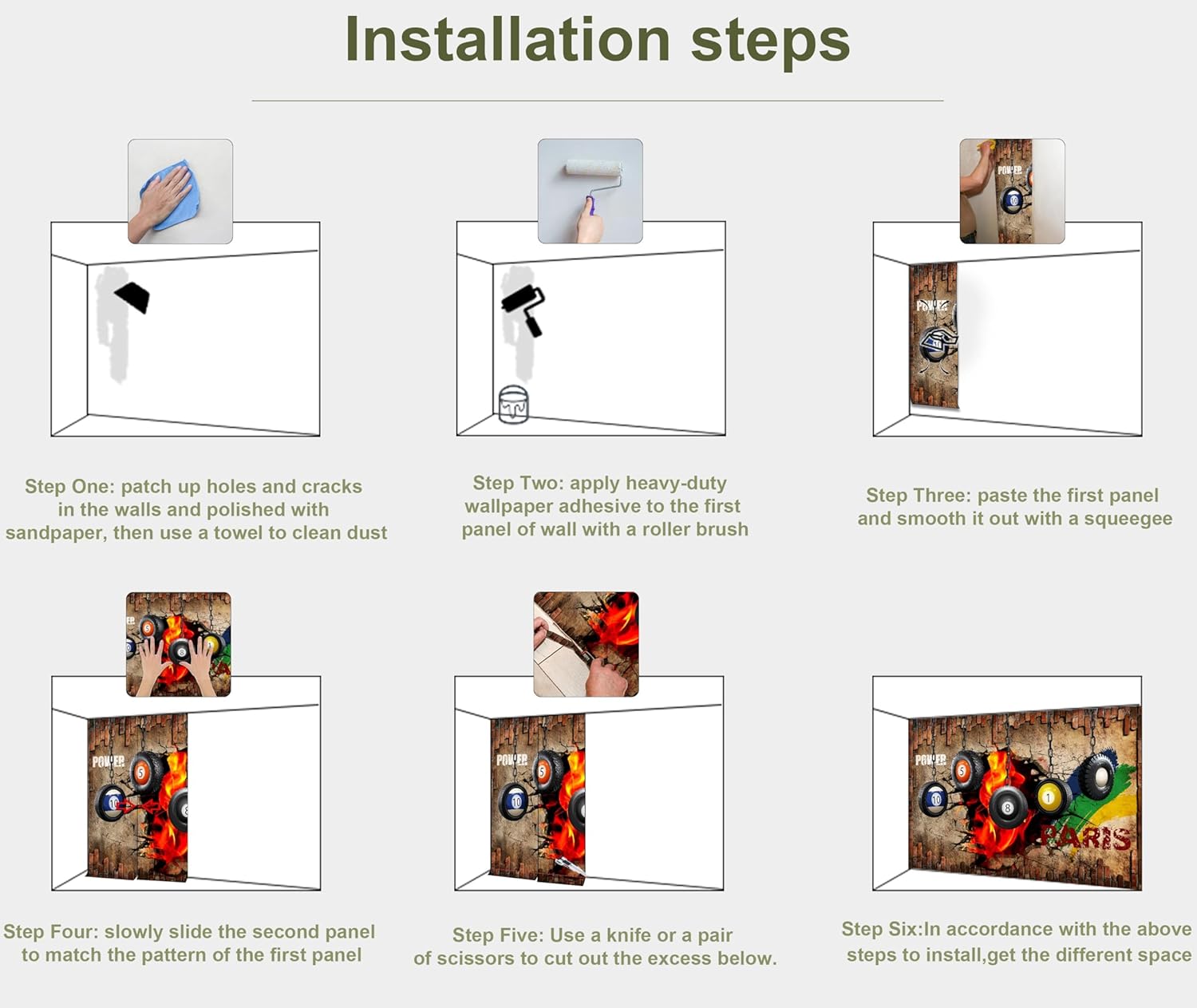 - INSTALLATION - 1.Fill in all cracks or holes and clean dust dirt and grease on the wall surface. 2. Apply the heavy duty wallpaper paste on the wall not mural. 3. Use a spirit level to mark first strip location. 4. match the pattern by sliding into place. 5.use a scraper to smooth out bubbles press. 6. Let dry for a few minutes and that's it! Please Note: Not self-adhesive. We recommend to use a standardized fleece wallpaper paste.