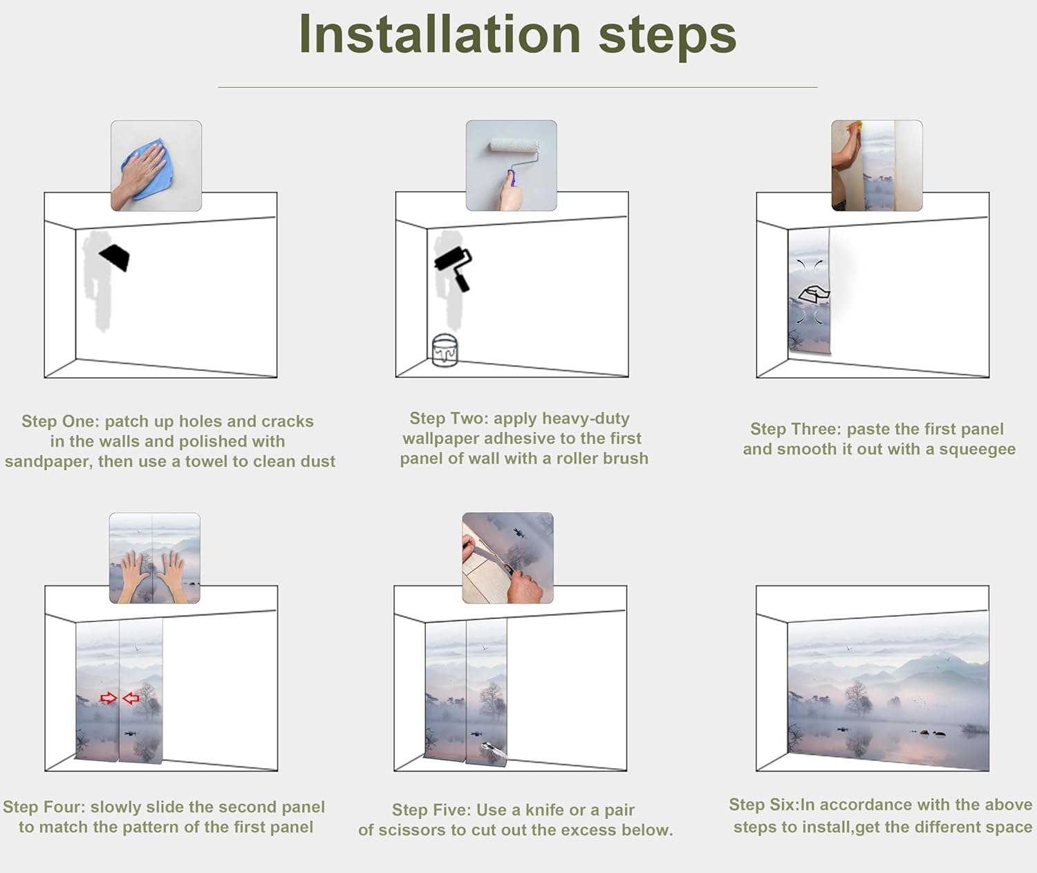 - INSTALLATION - 1.Fill in all cracks or holes and clean dust dirt and grease on the wall surface. 2. Apply the heavy duty wallpaper paste on the wall not mural. 3. Use a spirit level to mark first strip location. 4. match the pattern by sliding into place. 5.use a scraper to smooth out bubbles press. 6. Let dry for a few minutes and that's it! Please Note: Not self-adhesive. We recommend to use a standardized fleece wallpaper paste.