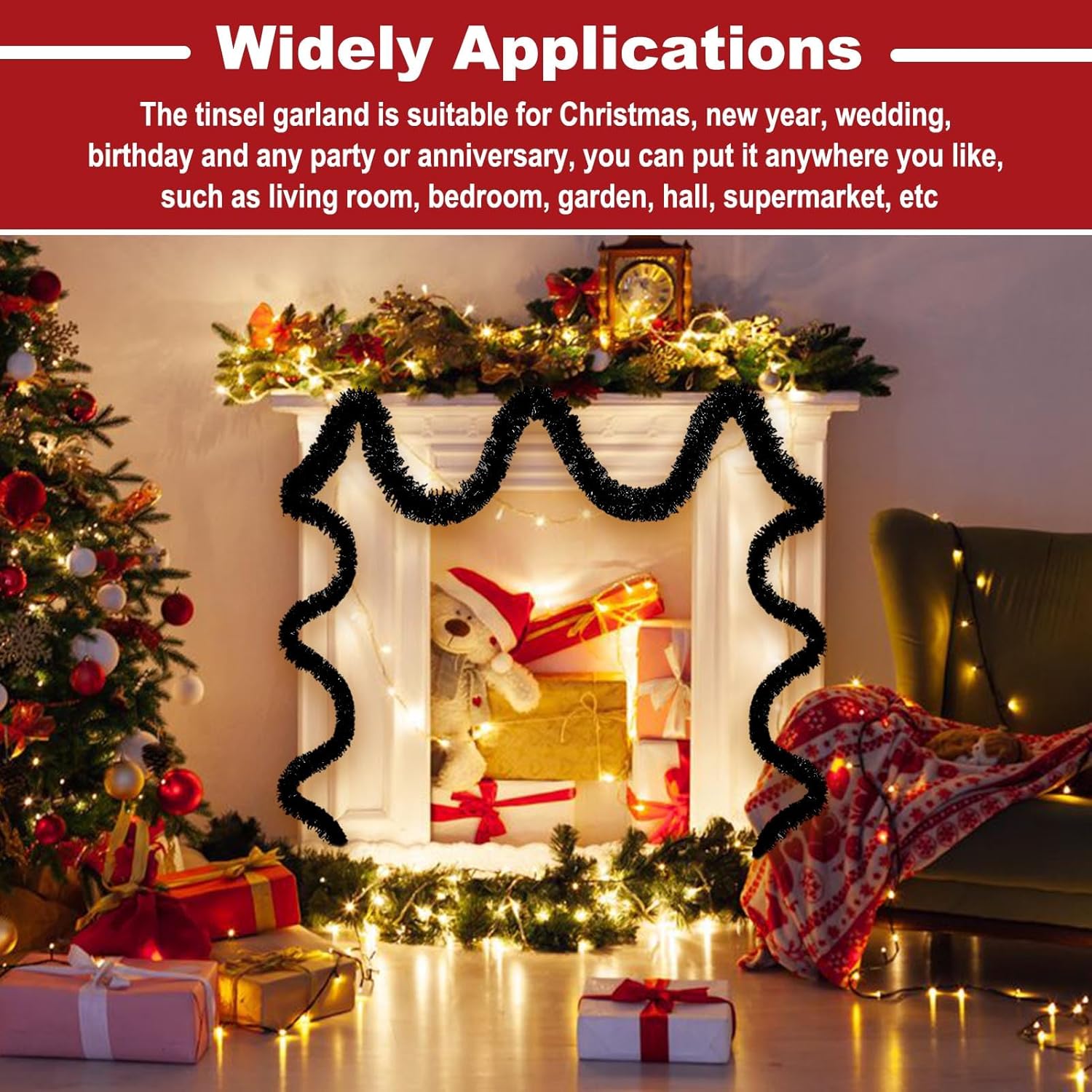 25 Feet Metallic Twist Tinsel Garland - Wall Hanging Backdrop for Parade Floats, Christmas Eve, New Year, Valentine's Day Parties (Black, 4in x 25ft)