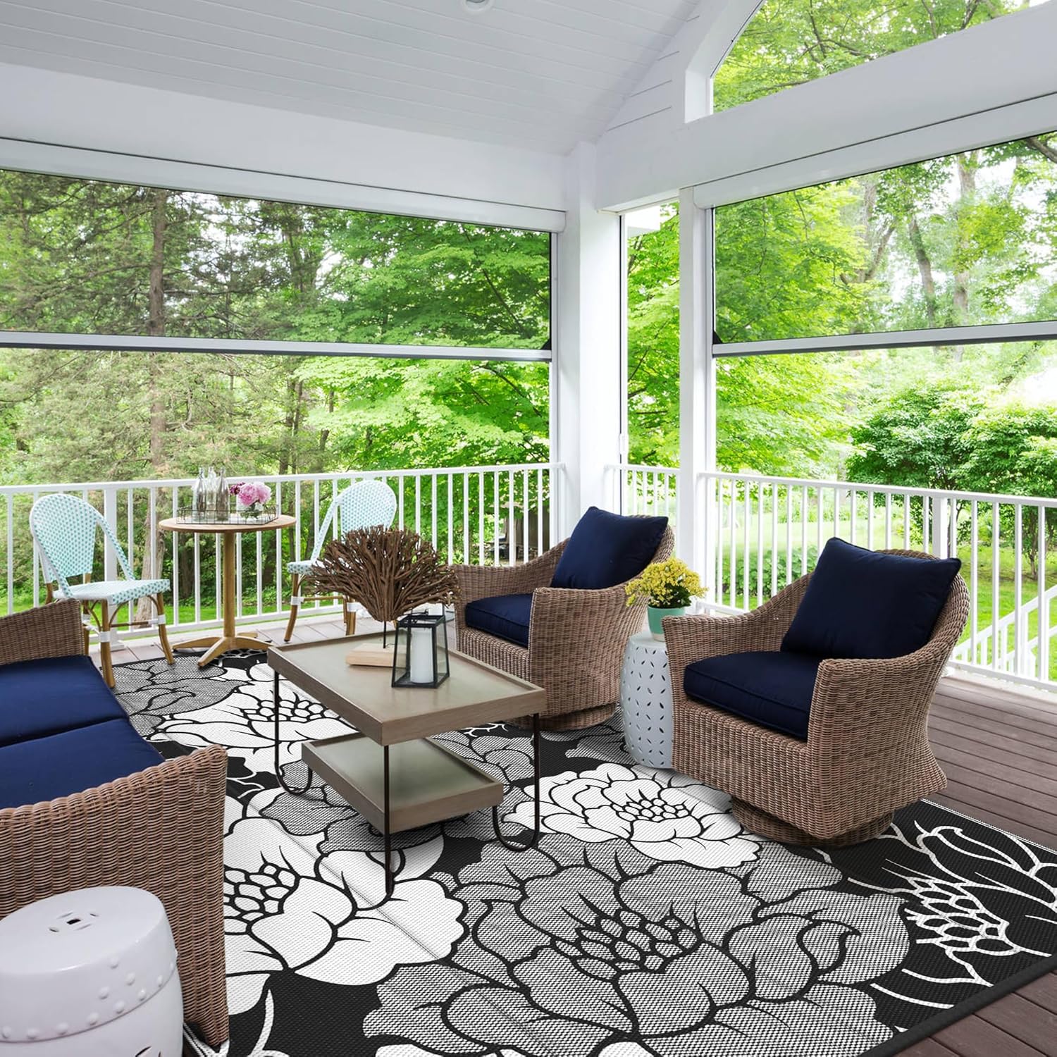 GENIMO Outdoor Rug Waterproof for Patio Decor, 9' x 12' Reversible Plastic Straw Floral Camping Carpet, Large Area Rugs Mats for RV, Camper, Deck, Balcony, Porch, Beach, Picnic, Mix-Black & White
