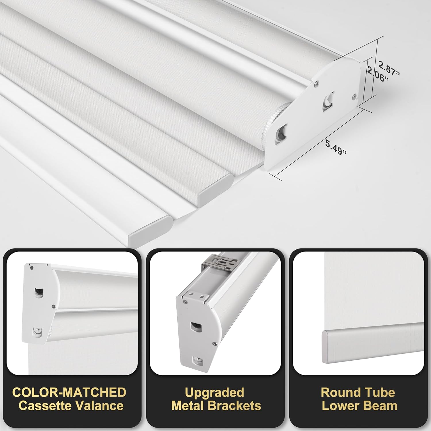 - FREE STOP CORDLESS SYSTEM:The cordless double roller shade prioritizes safety with a cordless design designed for families with small children or pets.You just need to pull down or push up to stop at any position you want. COLOR-MATCHED CASSETTE VALANCE:The hidden installation of the cordless roller blinds can effectively reduce installation gaps, reduce light leakage.The color of the cassette valance is same as the fabric color,making the day night blinds more beautiful after installation.