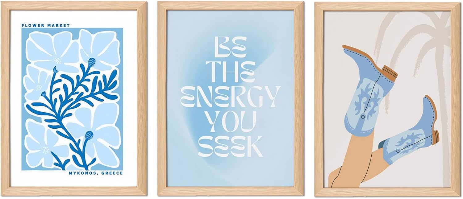 - Trendy Preppy Wall Art: This Blue Preppy Canvas Wall Art Set features a vibrant mix of coastal aesthetic and cowgirl style that will bring a fresh, beachy vibe to any room. The set includes three stunning prints, with designs inspired by modern floral patterns, motivational quotes, and trendy cowgirl boots, making it the perfect choice for a girly bedroom, college dorm, or living room.