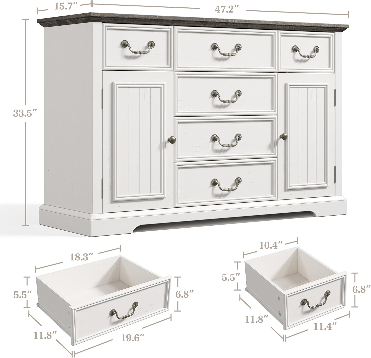 - [Spacious storage]: 47.2"W x 33.5"H x 15.7"D. The white dresser features 6 deep drawers for ample storage space. Great for bedroom,living room and entryway.Besides, the dresser for bedroom features 2 groove doors, offering versatile storage options and ample space for all your needs. Whether it's large towels or small jewelry boxes, you can keep your space tidy with easet.