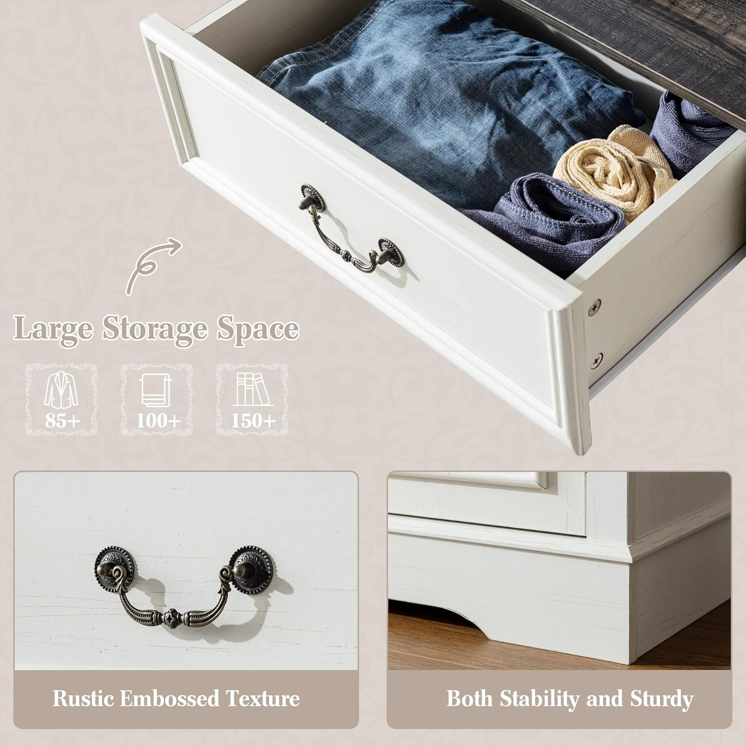 - [Multifunction white dresser for bedroom with storage organizer]: This wood dresser is ideal for wherever to save you from clutter and keep your space neat and tidy, such as the bedroom,closet, dorm, living room,dining room entryway and matches well with other bedroom furniture. Its elegant and functional design truly elevates your living space.