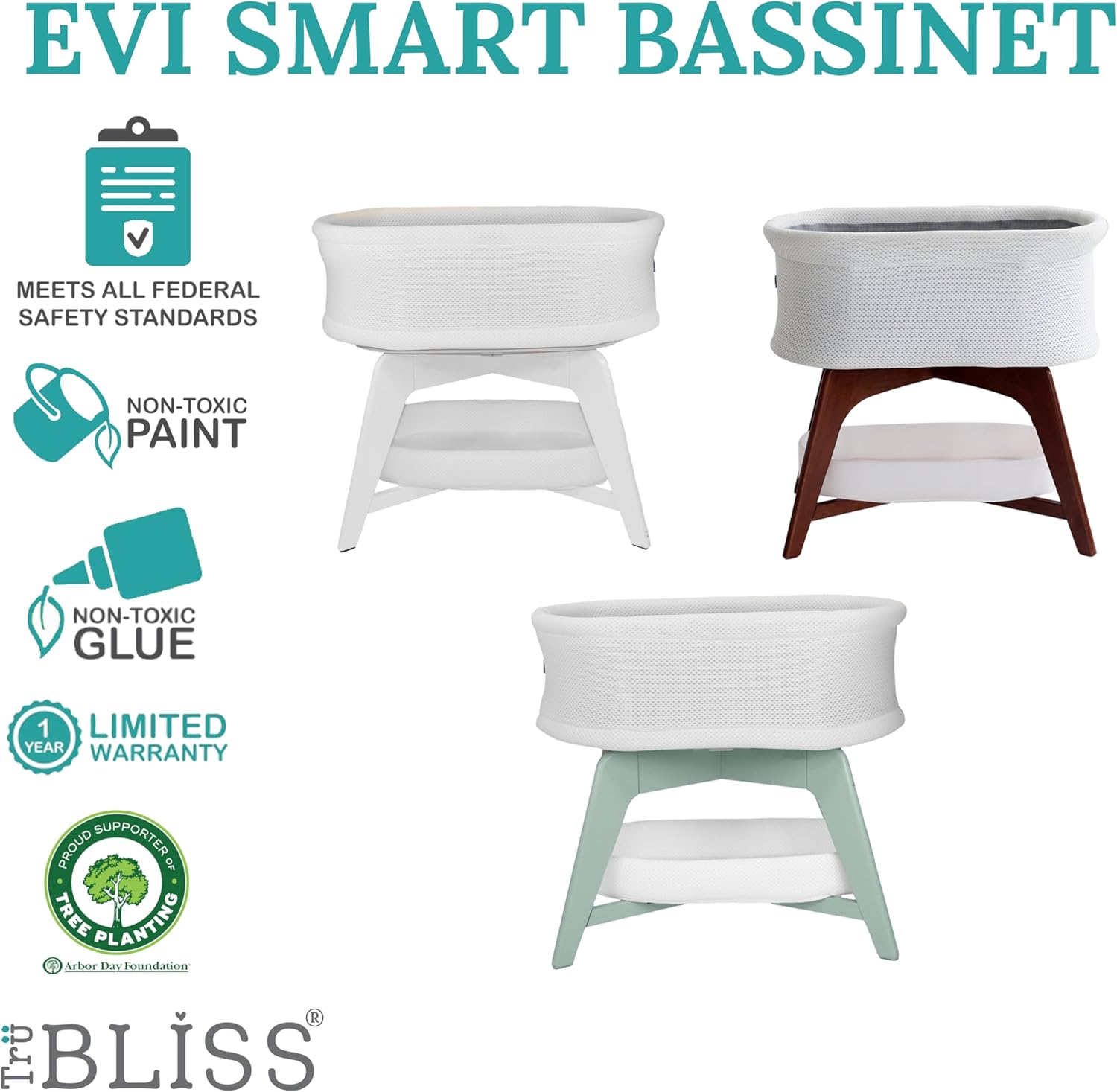 Evi Smart Baby Bassinet Beside Sleeper with Auto-Glide, Ambient Nightlight & Sensory Sounds, Compatible with Alexa and Google Home, Includes 2 Sheets (White w/Mint Green Base)