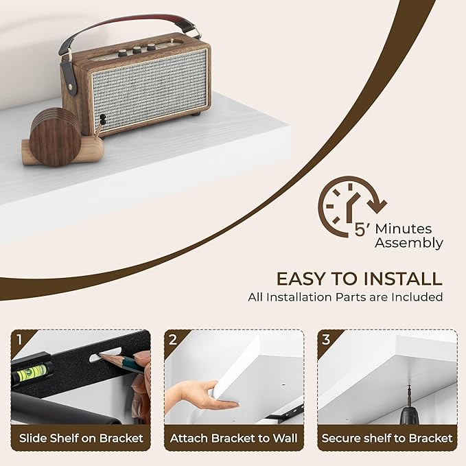 - Easy To Assemble: This floating shelves not only come with stainless-steel galvanized invisible brackets, but also equipped a fixing screw at the bottom to fix the shelf on the support rod, which solves the problem of sliding and is not easy to damage, and can be used for a long time. Instructions, magnetic level, drywall anchors, and screws included. This is great because you can easily mount these rustic shelves Gap-Free to any surface in less than 10 minutes