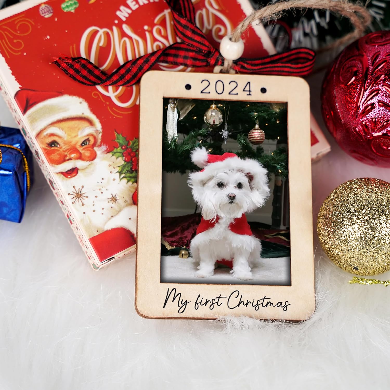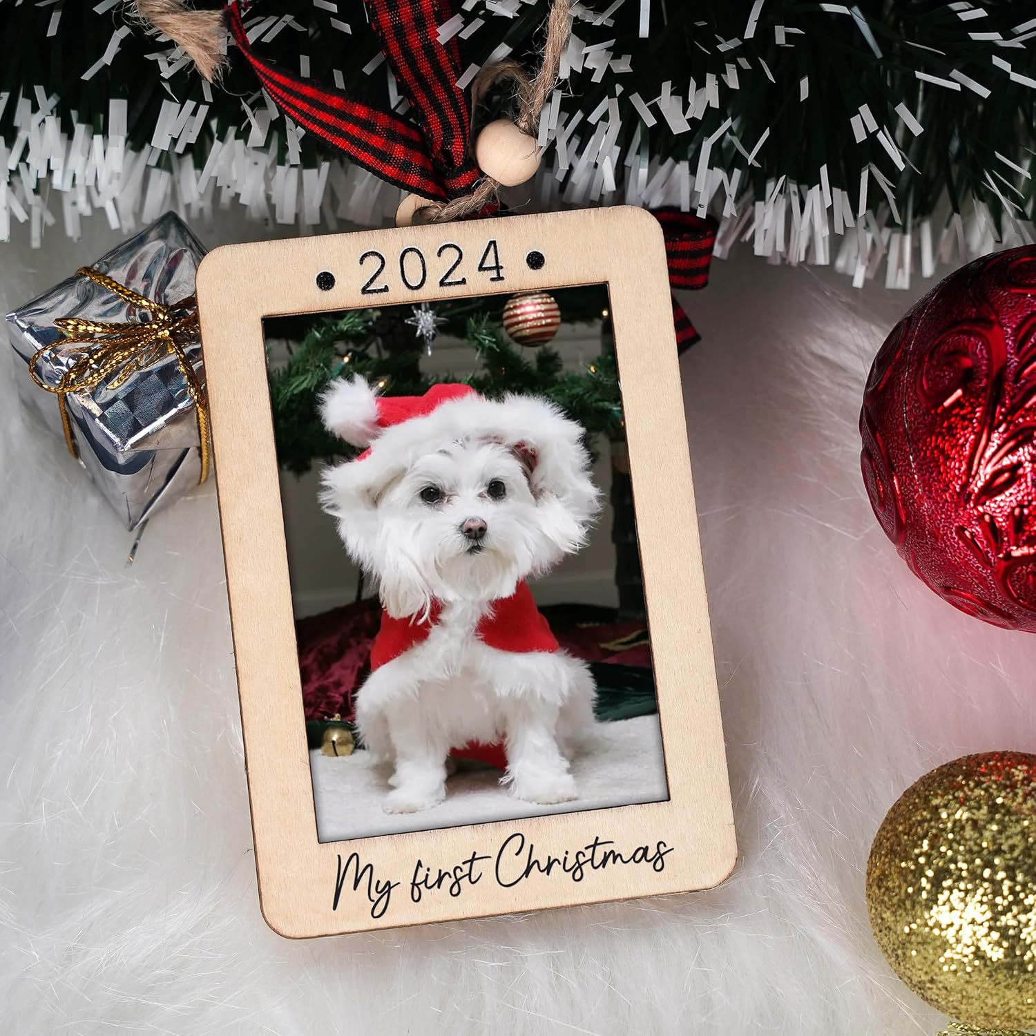 Christmas Photo Frame Ornament, 2025 Ornament, Wooden Picture Frame Ornaments With Hanging String (Dog)